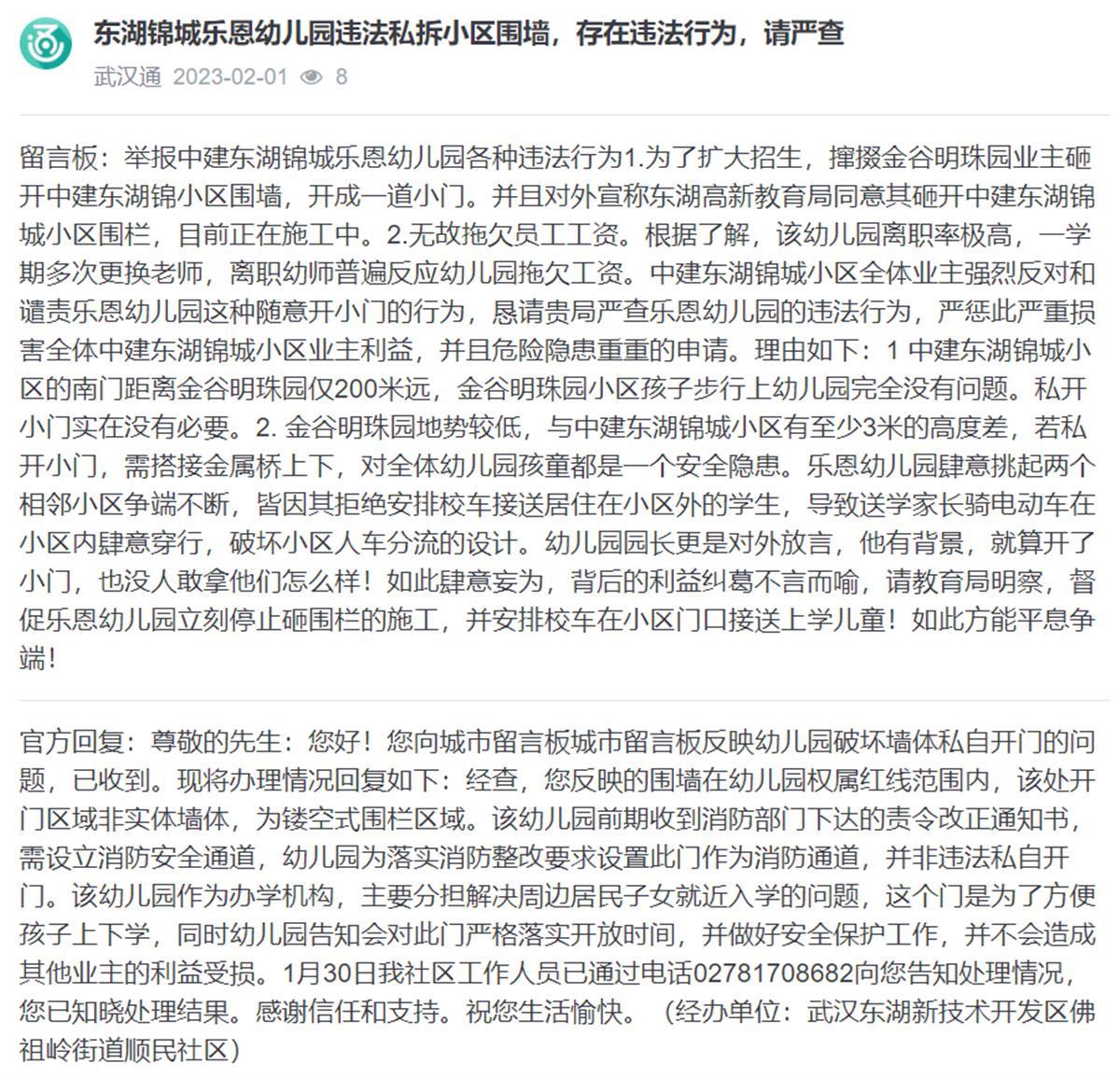 在网上的城市留言板可以看到,有小区业主就此事投诉过,而经办单位武汉东湖新技术开发区佛祖岭街道顺民社区在网上回复:“此事有业主曾在市长热线反映过,社区也传达了相关解释,业主反映的围墙在幼儿园权属红线范围内,该处开门区域非实体墙体,为镂空式围栏区域。该幼儿园前期收到消防部门下达的责令改正通知书,需设立消防安全通道,幼儿园为落实消防整改要求设置此门作为消防通道,并非违法私自开门。该幼儿园作为办学机构,主要分担解决周边居民子女就近入学的问题,这个门也是为了方便孩子上下学。同时幼儿园告知会对此门严格落实开放时间,并做好安全保护工作,并不会造成其他业主的利益受损,希望业主可以理解。”