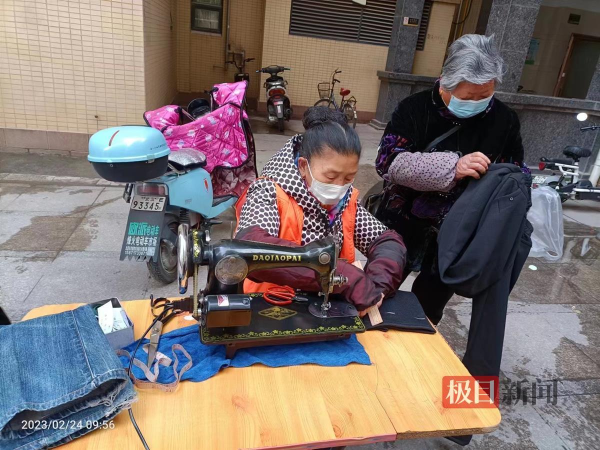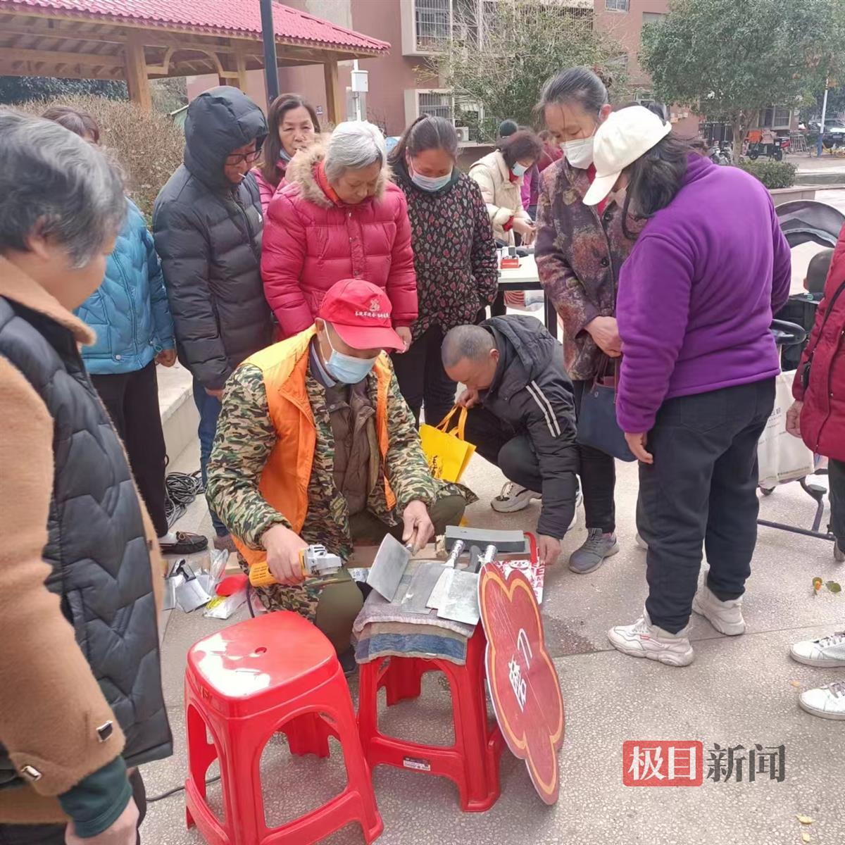 当天,便民服务活动在光霞社区波光霞影小区进行,现场可以量血压、测血糖、磨刀、修补衣物,每个“档口”都有不少居民排队。刘婆婆因腿脚不便,大家纷纷为她让行。看着刘婆婆的理发效果,越来越多的人聚集过来。