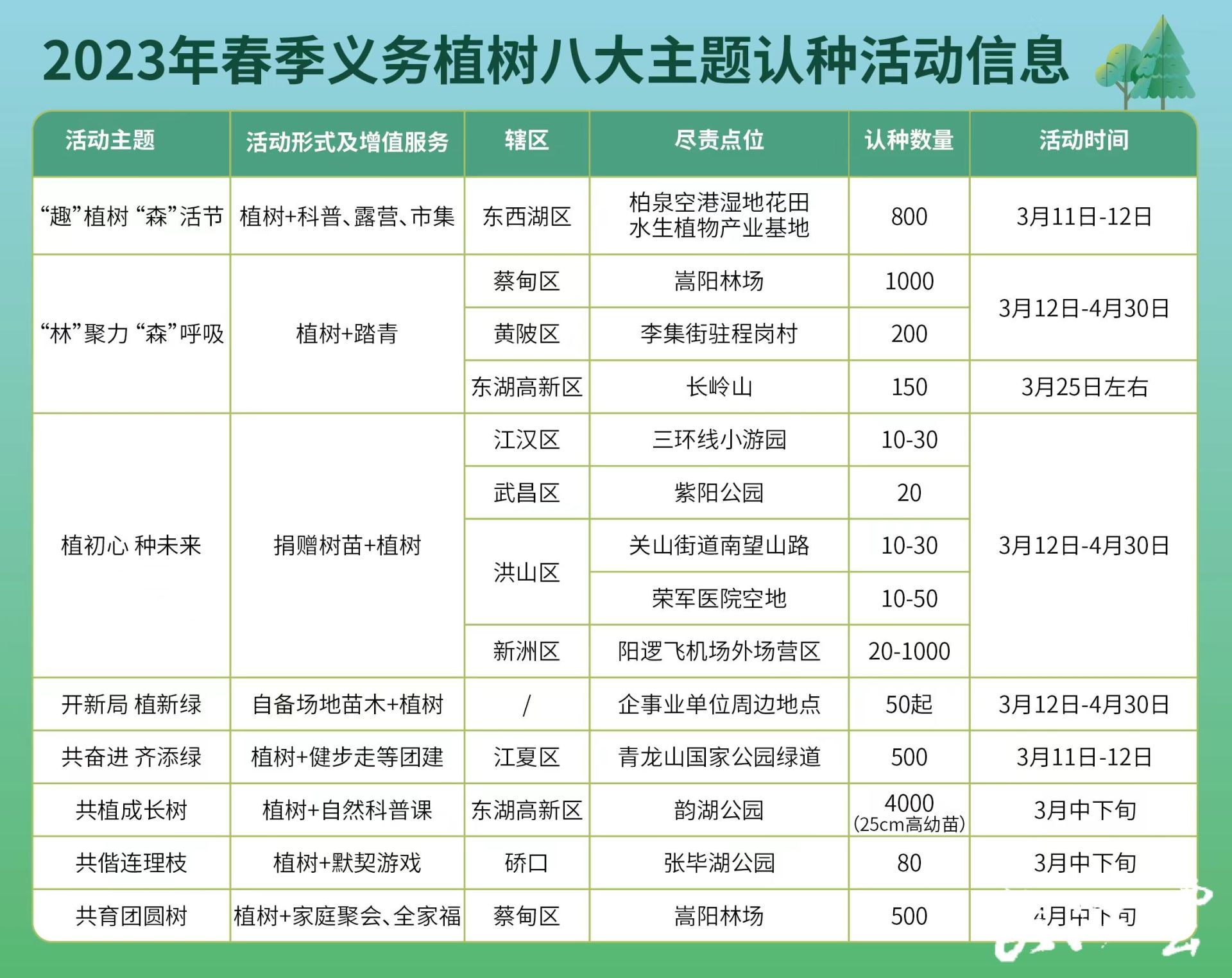据武汉市绿化委员会办公室负责人介绍,今年3月12日是第44个植树节,武汉市积极响应全国绿化委员会办公室倡导的八类义务植树尽责形式,为满足社会各界植绿热情,尤其是一些企事业单位和市民家庭的个性化需求,带动更广泛的参与,推出以“绿动武汉”为主题的系列植树活动。全市共设置17个植树点和24个认养点,开展植树认养、主题认种两大类活动。
