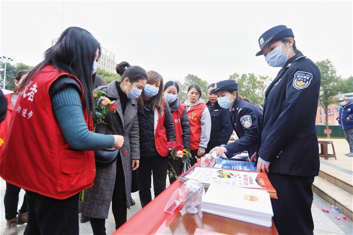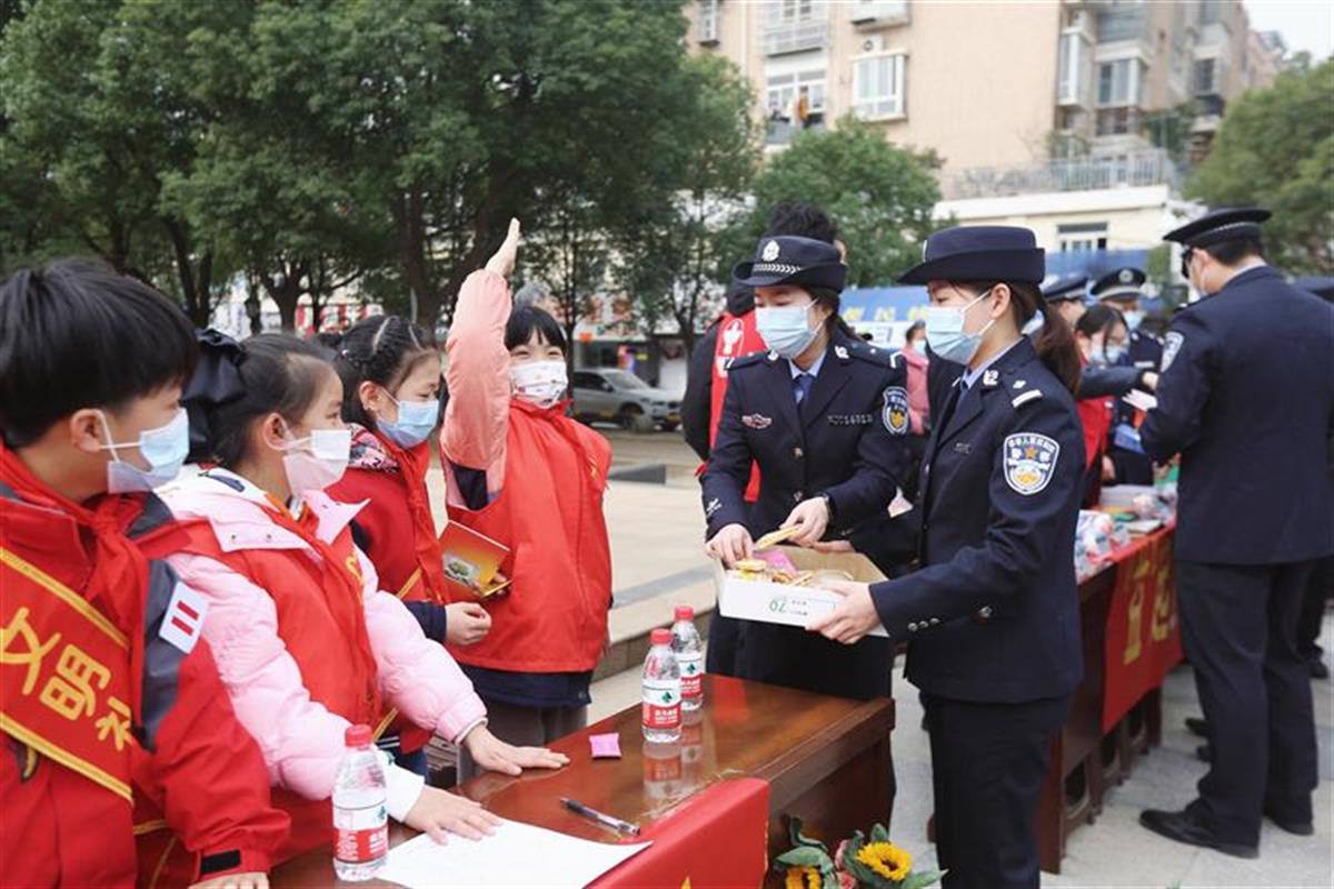 武汉市公安局禁毒支队民警王哲,拿起各式各样的仿真毒品模型,向围观的居民和少先队员们讲解了毒品的隐蔽性、危害性,以及如何辨别毒品的知识,并向少先队员们发放了禁毒宣传手册。“珍爱生命,远离毒品!”一名少先队员向民警们回赠鲜花,还郑重地敬了一个标准的少先队队礼。