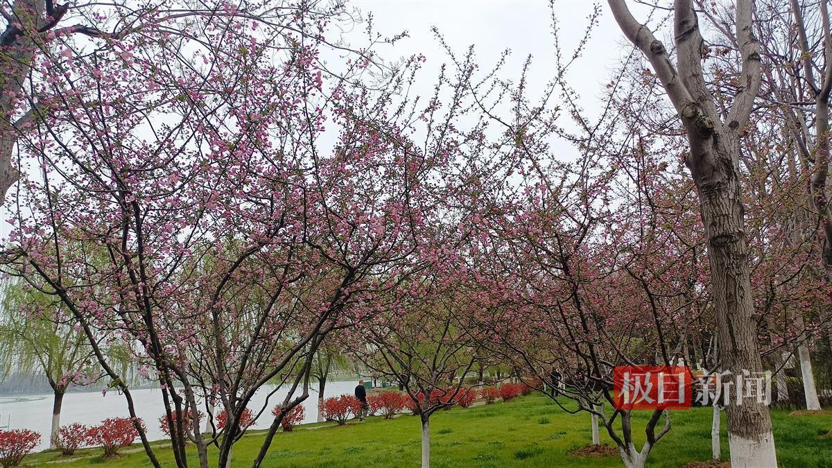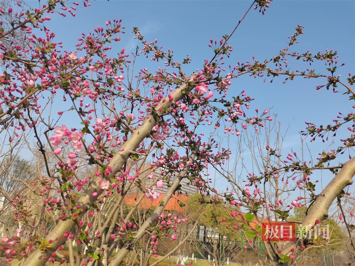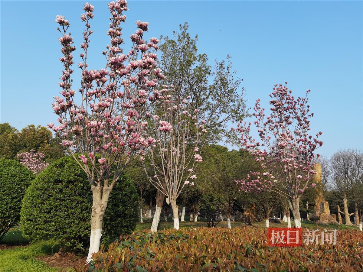 环顾三镇,南湖幸福湾公园,最为热闹的当属紫色的二乔玉兰,一齐绽放,特有气势,湖边嫩柳依依,与青草坪上的朱红色铁梗海棠相映衬,一片海棠林也渐成气候,“再过几天,就似一抹红霞了。”该园工作人员陈琳预告了它的胜景。