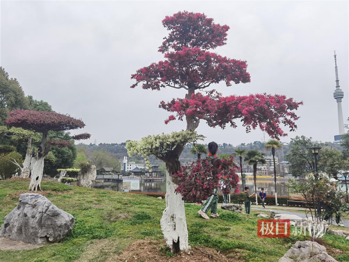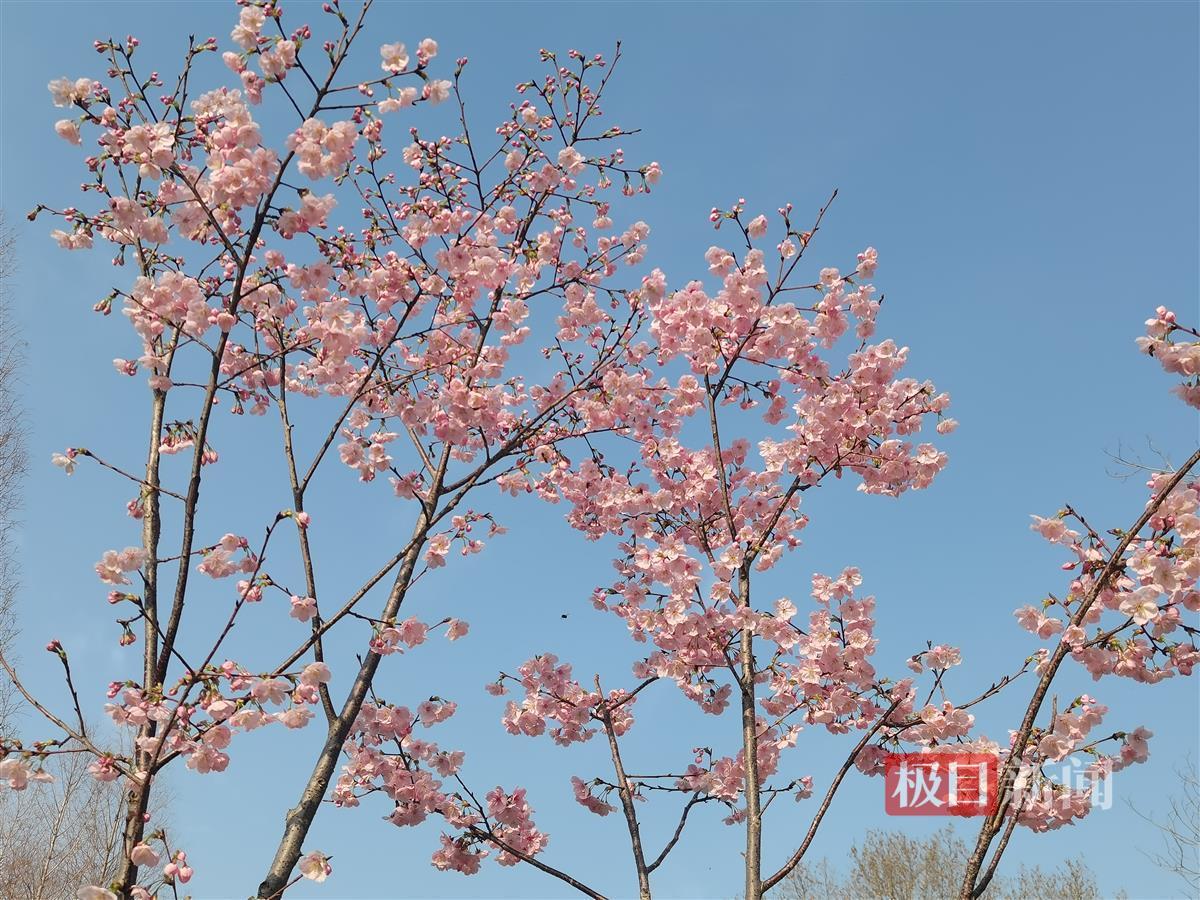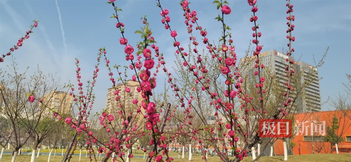 常青公园内,蓝天映衬、早樱粉嫩,红叶碧桃开了,花色耀眼,海棠含苞待放,玫红色花苞特别美艳,有一株紫红色重瓣榆叶梅别错过,“我们公园仅此一株,是公园的宝贝。”该园管理处主任彭敏特别推荐道,榆叶梅是蔷薇科、桃属植物,叶似榆,花如梅,故名榆叶梅,而这棵是重瓣的,很有看点;它与梅花同科不同属,梅花是蔷薇科李属木本植物。