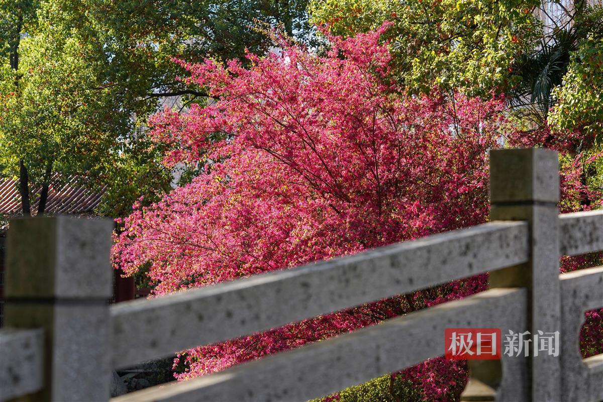 此外,公园内的含笑、海棠、玉兰也在盛放,多种花树同时展露笑颜,春意盎然,令人心旷神怡。在公园一角,巨紫荆身形高大笔直,树冠似伞形,花开时,一朵朵紫红色的花簇生在枝头,仿佛一只只紫蝶,煞是好看。而在青山公园松涛亭旁的一处绿地里,栽种着十多株贴梗海棠。一人多高的树上,满满当当红彤彤一片,每一朵海棠花都开得艳丽又恣意。大红大绿的配色,张扬又喜庆,惹得游人纷纷拍照留影。