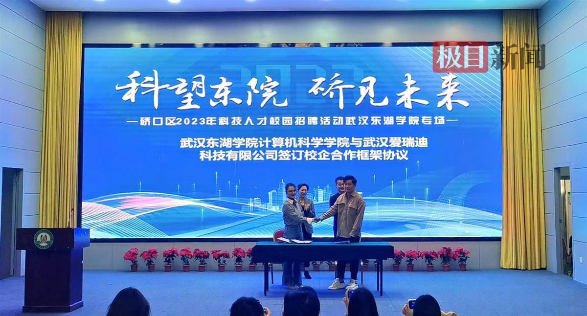 活动现场,武汉东湖学院与武汉爱瑞迪科技有限公司签订校企合作协议,将东湖学院的学科优势、科研优势、人才优势与硚口区的战略需求、产业优势、资源优势紧密结合,进一步加强学科建设、产业发展、人才培养等方面的交流合作和“校企地”战略合作。