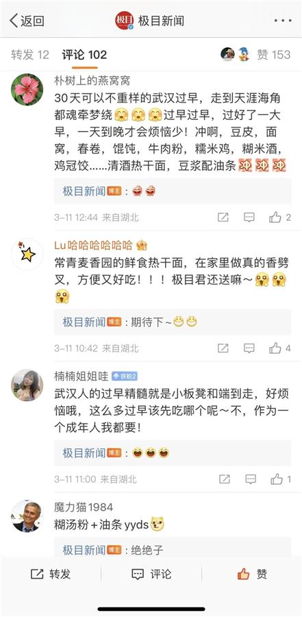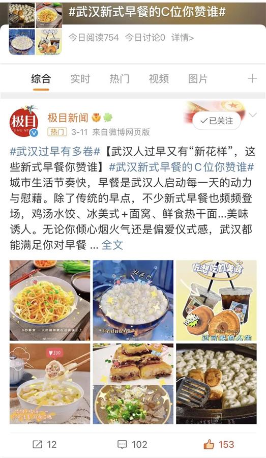 3月11日活动在极目新闻官方微博推出以来,收到了热烈的响应。据极目新闻记者统计,截至目前,极目新闻发起的微博话题#武汉新式早餐的C位你赞谁#,阅读量已过50万次。