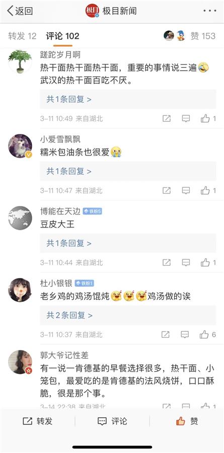 “武汉人的过早精髓就是小板凳和端到走,这么多过早该先吃哪个呢?不,作为一个成年人我都要”“作为一个武汉人,离开一段时间回来,只有来一碗热干面,才觉得灵魂回到了身体里”“常青麦香园的鲜食热干面,在家里做真的香劈叉”“大学在武汉的时候特别喜欢吃四季美的汤包,现在回安徽工作,每天还是要来一碗老乡鸡的鸡汤馄饨。反正就是早餐的时候要有汤”……网友们一条条热情发言,带着火热的情感,也带着对一座城市的深爱。经评论区的推荐,目前已有老乡鸡鸡汤馄饨、麦香园鲜食热干面、肯德基法风烧饼等十余种早餐入选,还没推荐或投票的朋友请抓紧,为你心爱的早餐投出神圣的一票。无论你喜欢甜还是咸,追求原味的本色还是辣味的火爆,不论你倾心烟火人间的轻松随意,还是偏爱有型有款的仪式感,你的这一票,都很重要。你最爱的早餐,应该被更多人看到。