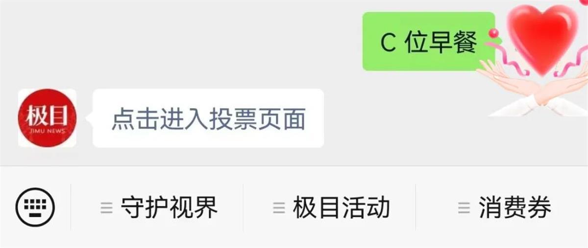 进入“极目新闻”微信公众号,私信回复关键字“C位早餐”,即可进入专题页面,为您支持的早餐投票。