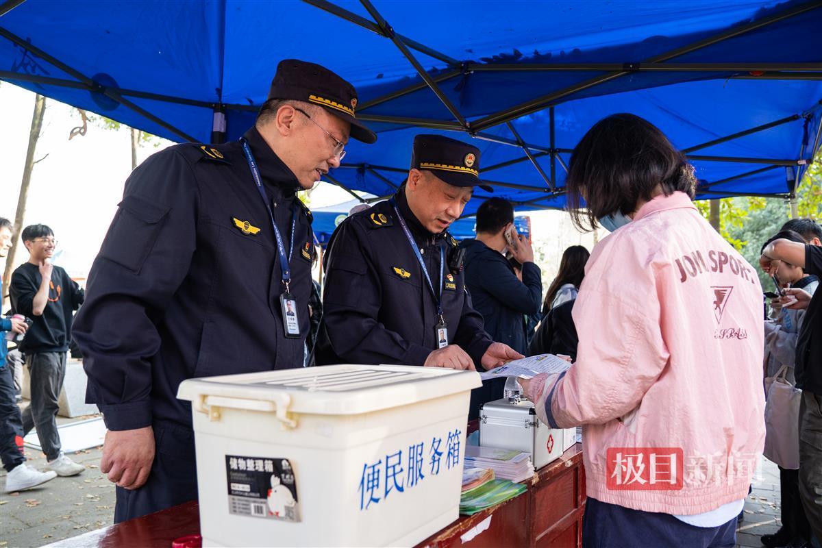 “请问最近出校园的大门怎么走?”在万林艺术博物馆前,珞珈山街道综合执法中心设立了宣传服务点。除了随时为游客指路,工作人员还准备了便民服务箱和针线盒。执法队员介绍,便民服务箱内包含了10余种急救药品和应急工具,针线盒也可以提供给需要缝补衣物的游客。现场街道还邀请书法爱好者,以花为名为游客题字,受到游客欢迎。