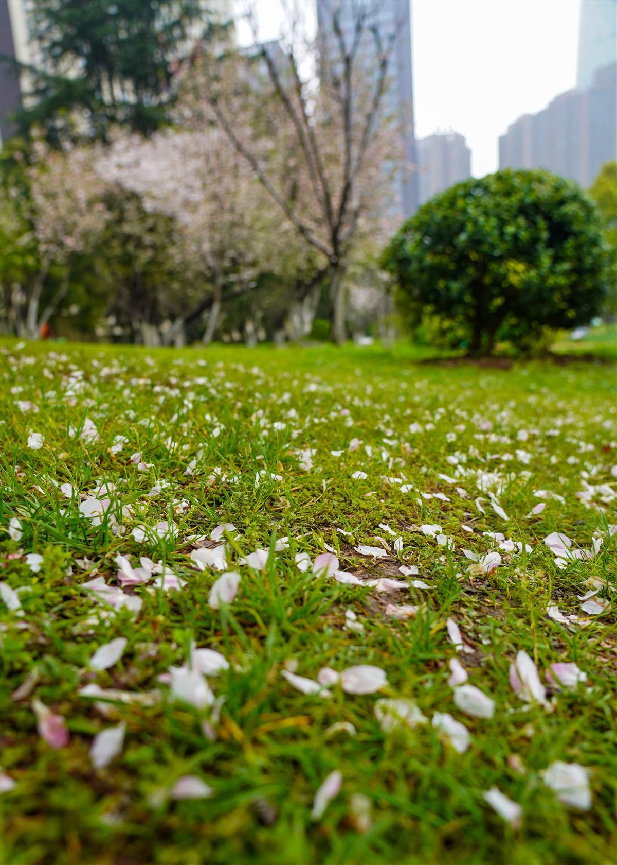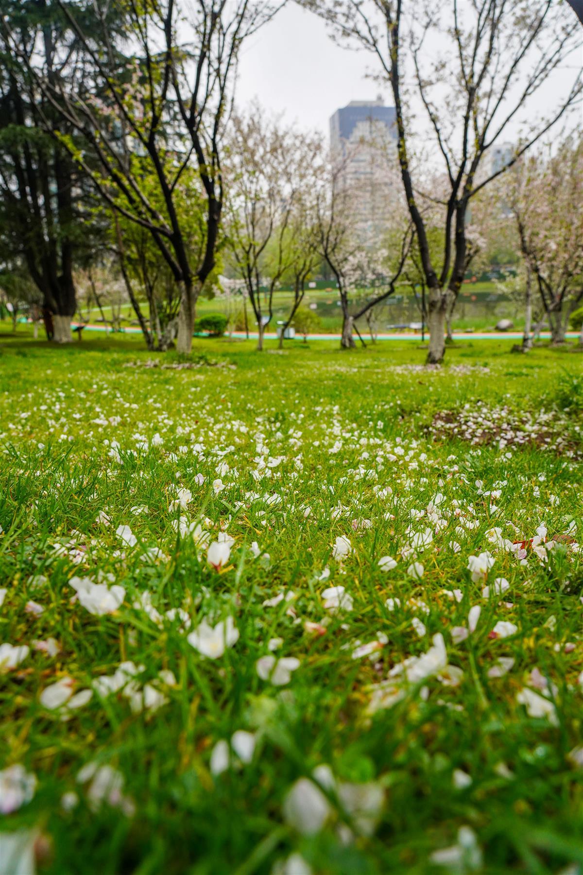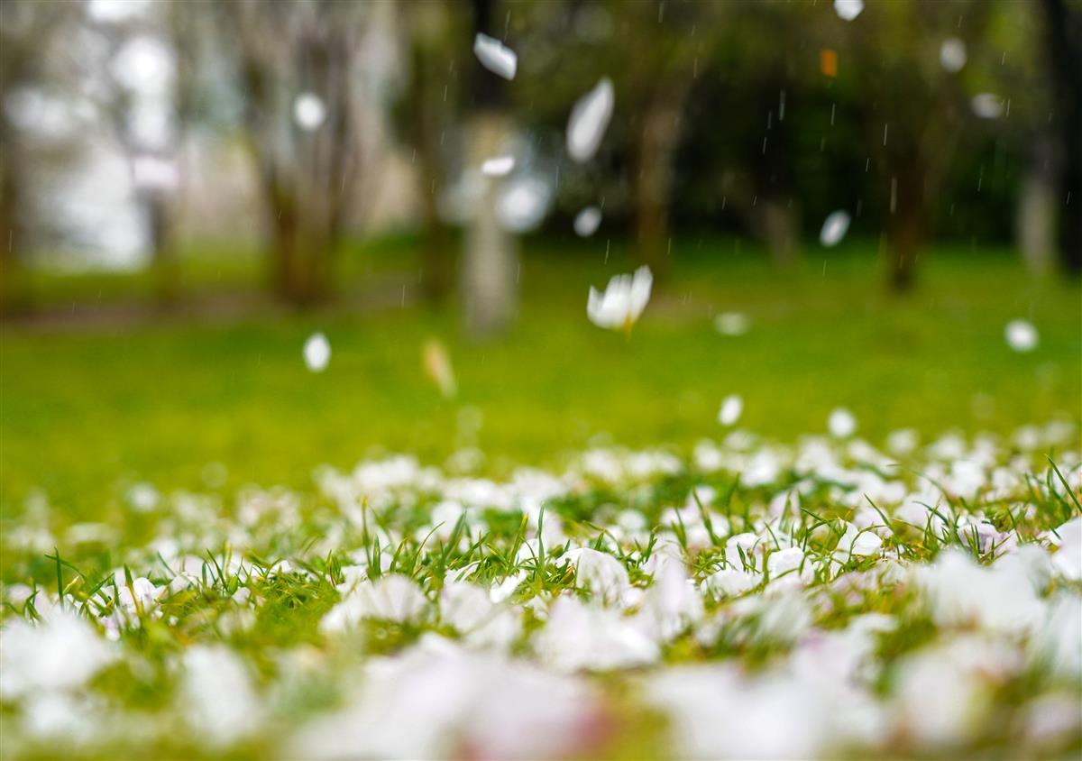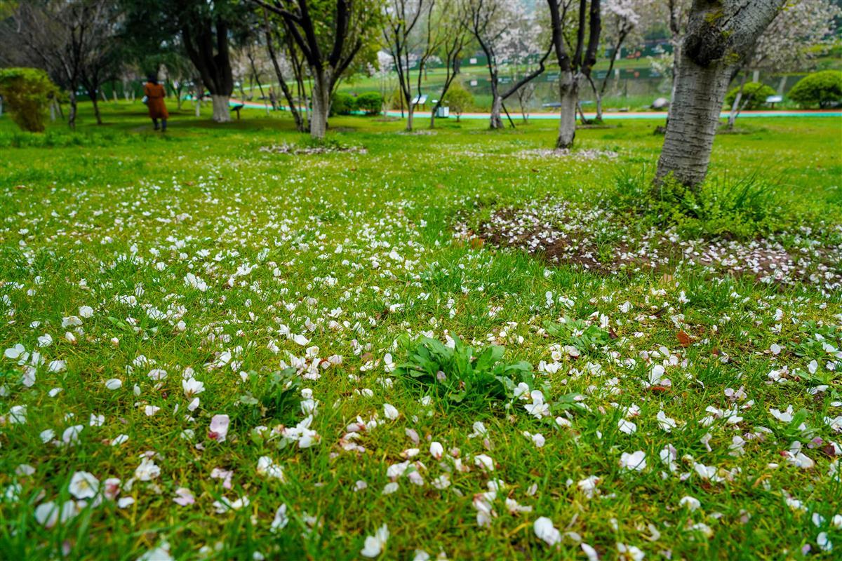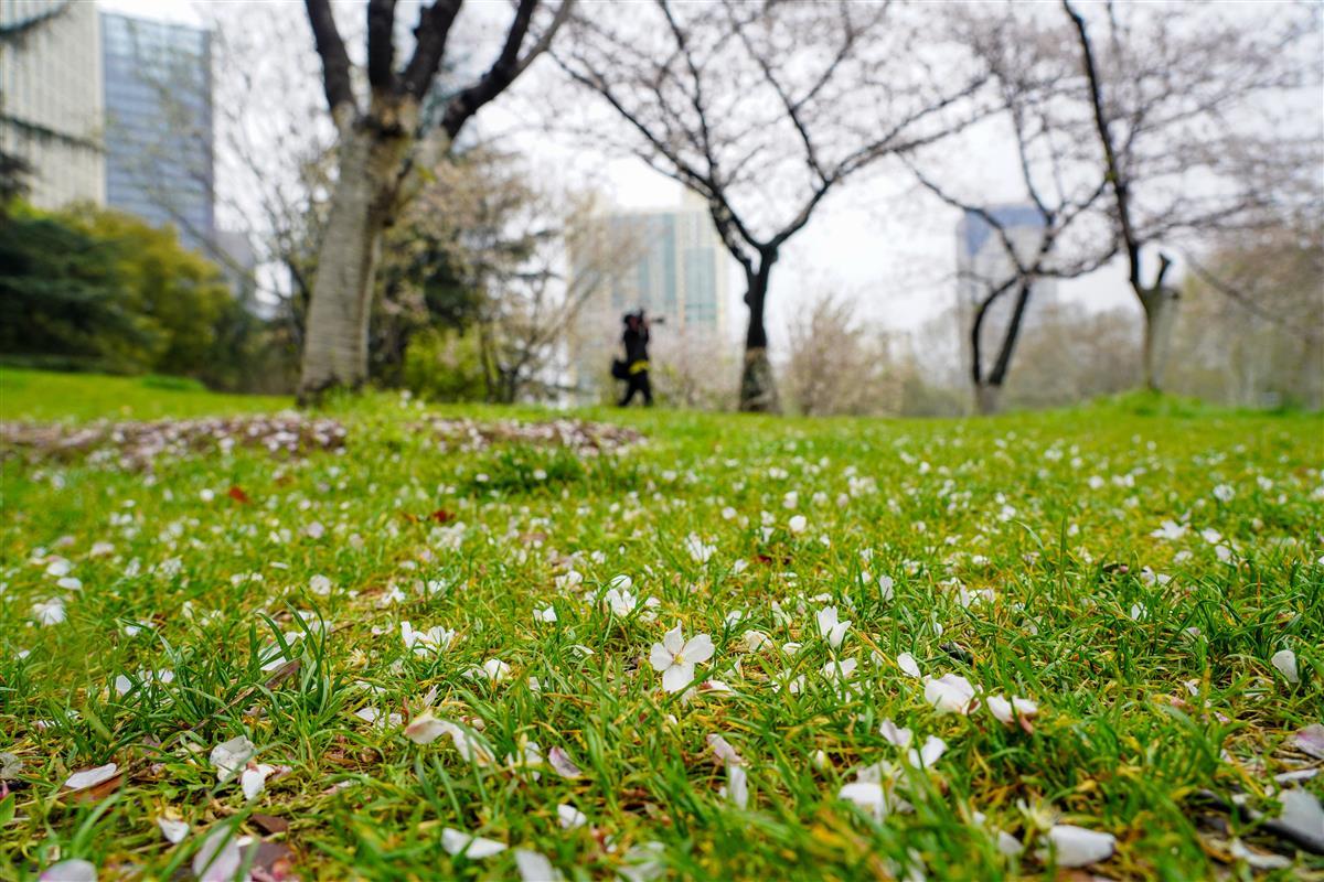 3月21日,汉口解放公园内,连续多日的风雨天气,打落了园内樱花树不少花瓣,地面像铺上了一层花毯,格外美丽。让人不禁想起龚自珍的名句“落红不是无情物,化作春泥更护花”。缤纷落英,成为春天里一道别样的风景。