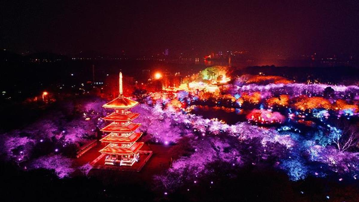 武汉以“相约春天赏樱花”为主线,营造全城赏花、全时赏花的氛围。武汉东湖樱园内栽种有上万株樱花,从3月初至4月上旬“接力”绽放。今年,“夜间赏樱”全新升级,樱花园内共设立有9000多套夜灯、500个灯笼。夜幕降临,唐风建筑群“曲院樱艳”和樱花海相互映衬,带给游客重回盛唐的梦幻体验。