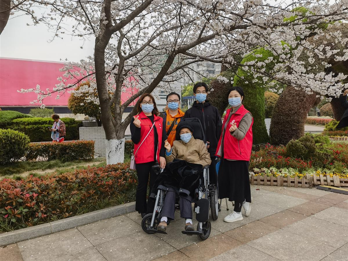 征求李女士的意愿后,水果湖街道社工站联合茶港社区、武汉大学“哲里有爱”志愿服务队共同帮助其完成欣赏樱花美景的微心愿。