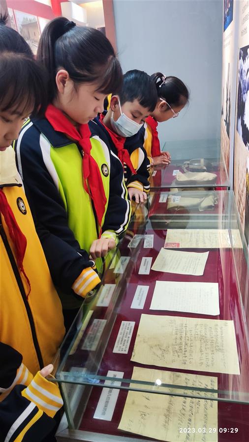 在“沙家浜”团长洪定泰展室,学生代表六(1)班张羽彤同学从讲解员村支书陶维红的讲解中得知洪定泰生于1919年,13岁参加革命,1934年参加红军,1939年加入中国共产党,先后参加鲁南战役、枣庄战役、孟良崮战役、豫东战役、济南战役、淮海战役。特别是看完保存完好的洪定泰烈士的一封封家书,张羽彤同学流下了感动的泪水。她说:“没有读过一天书的洪定泰烈士写这么工整的家书,真是让我们没有理由好好上学,看完33位革命烈士的英勇事迹,越发感受到今天的幸福生活来之不易,今后不辜负烈士的遗愿,长大后,立志做一个对社会有用的人。”