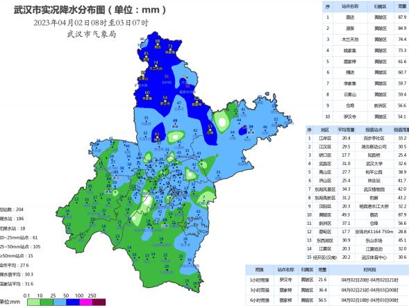 最大累计雨量为黄陂区蔡店站87.9毫米。最大小时雨强为黄陂区罗汉寺站21.6毫米(出现时间02日20时~21时)。