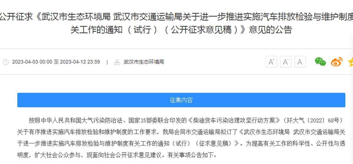 武汉汽车排放与检验维护制度将于2023年7月1日起执行。4月4日,极目新闻记者获悉,武汉市生态环境局联合武汉市交通运输局拟订了《关于进一步推进实施汽车排放检验与维护制度有关工作的通知(试行)(征求意见稿)》。现向社会公众征求意见,截止时间为2023年4月12日。