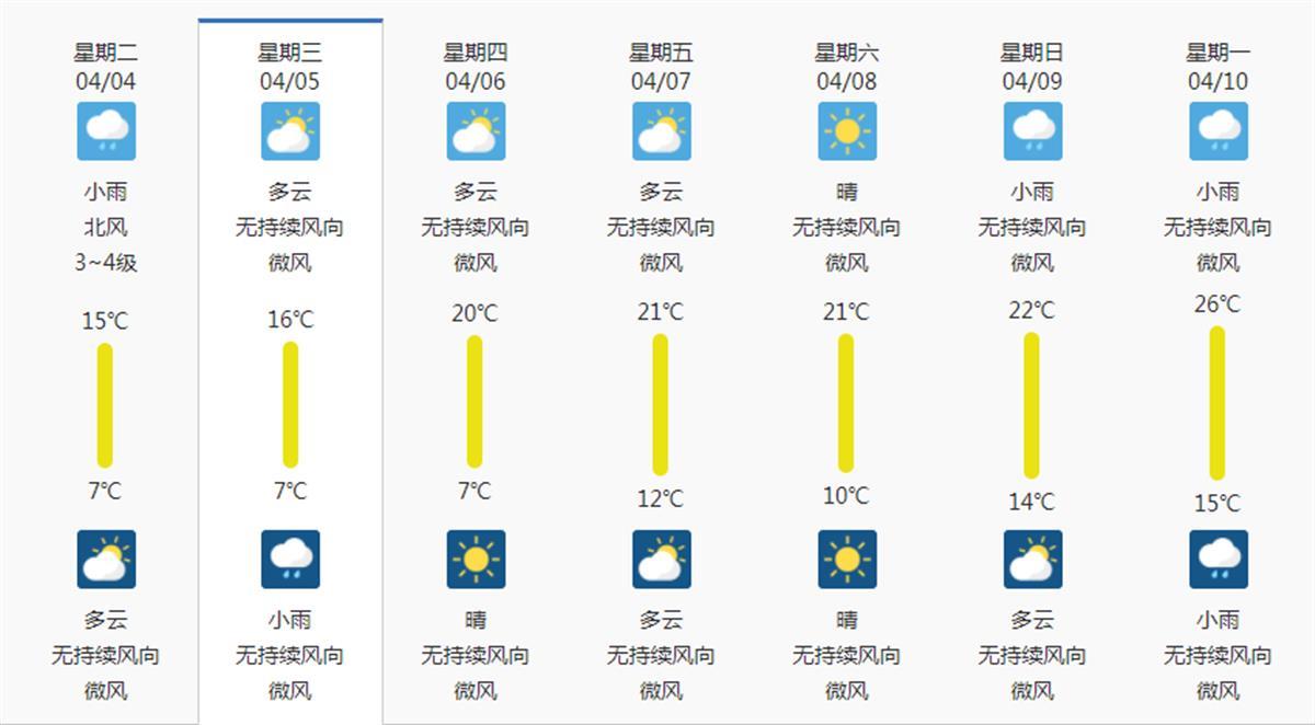 根据气象台部门预报,清明节当天天气多云为主,夜间转小雨,微风1级,气温7~16℃。由于今年清明假期实行单休放假,短途出行需求大幅增加,预计市内出游车流、人流量明显上升。