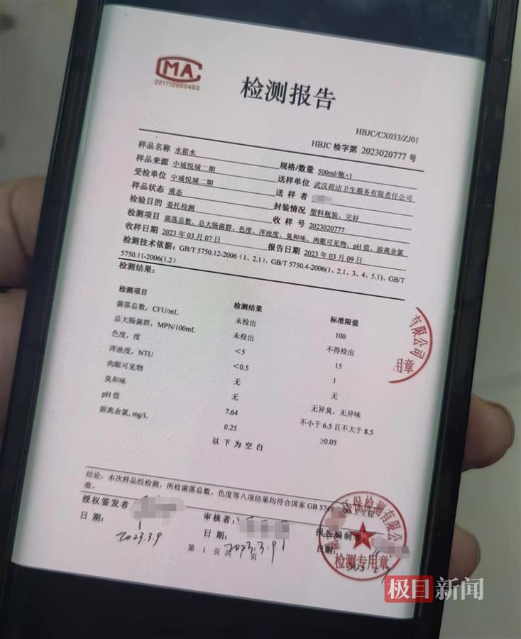 当天,极目新闻记者来到当事小区探访。小区物业表示,他们每季度都会对水箱进行清洗,也出具了相应的检测报告。面对业主的顾)虑,记者协调武汉市水务集团专业检测员,现场检测业主家中水质。