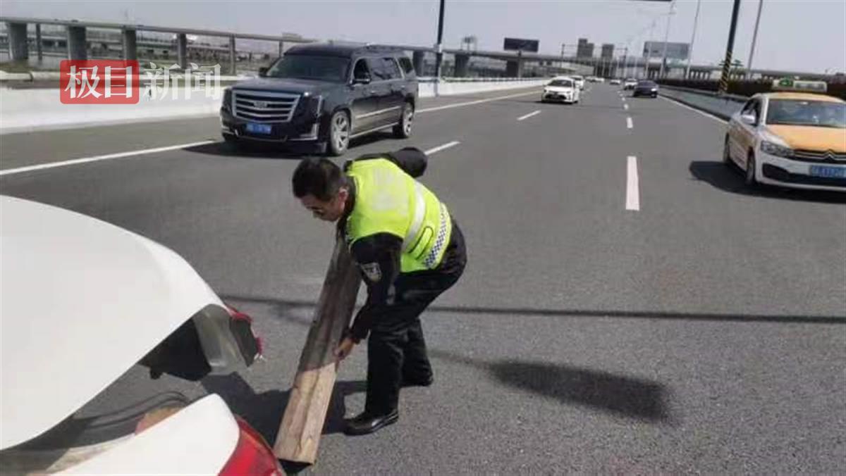 几乎在同一时间,该大队一中队民警徐伟、辅警张发雄驾驶警车巡逻至机场二通道10公里处,发现前面行驶的车辆纷纷往道路两侧急打方向并猛踩刹车,原来,一根枕木横倒在行车道中间。二人立即停车,做好安全防护后,合力将枕木抬起,放至警车后备箱。