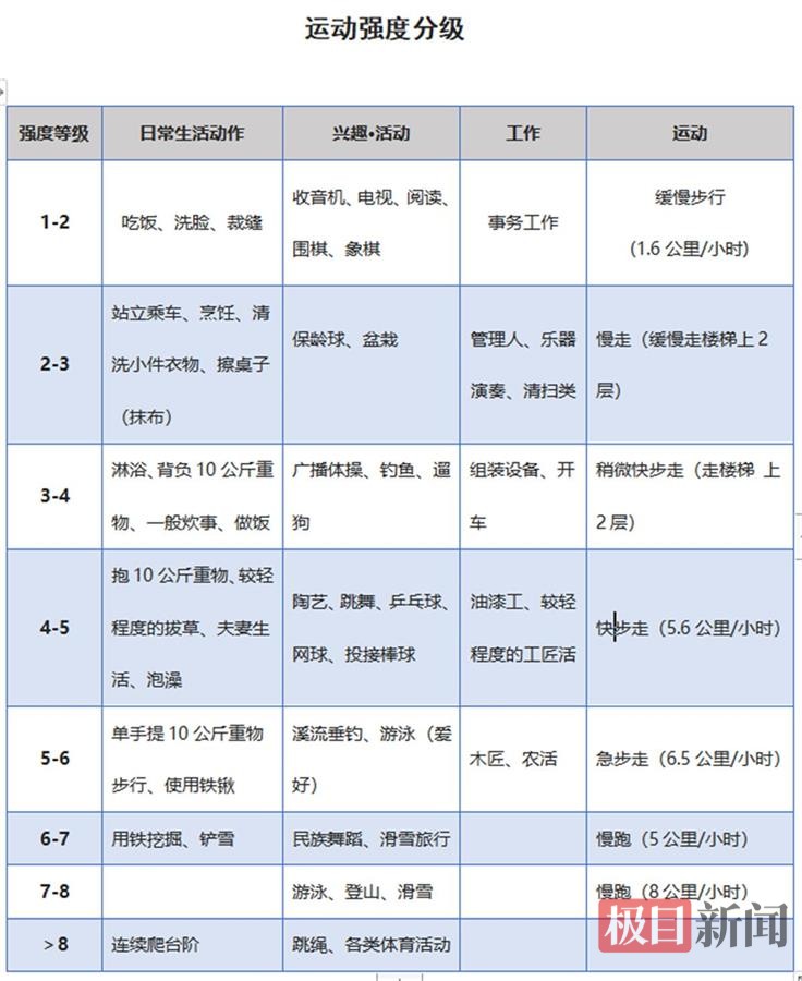 极目新闻记者看到,6.5公里/小时的急步走运动强度为6级,5公里/小时的慢跑为6至7级,8公里/小时的慢跑、游泳则为7至8级,跳绳、踢足球在8级以上,而马拉松等均为最高级别10级。