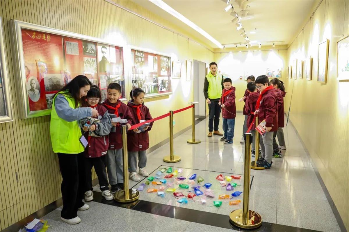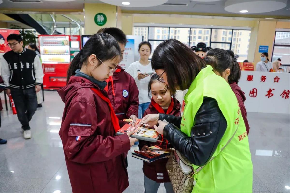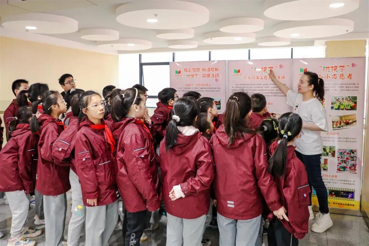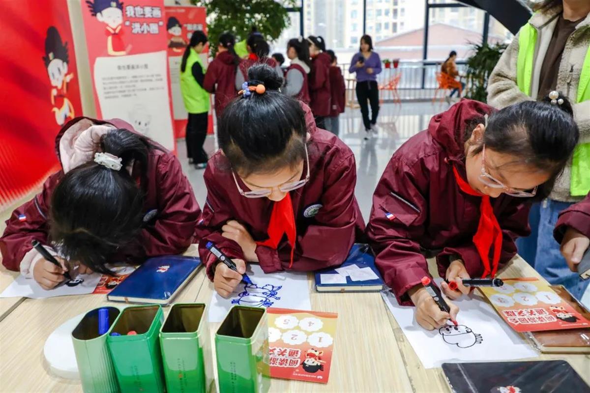 武珞路小学金地分校的小学生们,通过“按‘图’索骥”的方式,完成五大主题打卡点,配全“通关文牒”后,可在服务台兑换洪小图文创盲盒礼包一份。