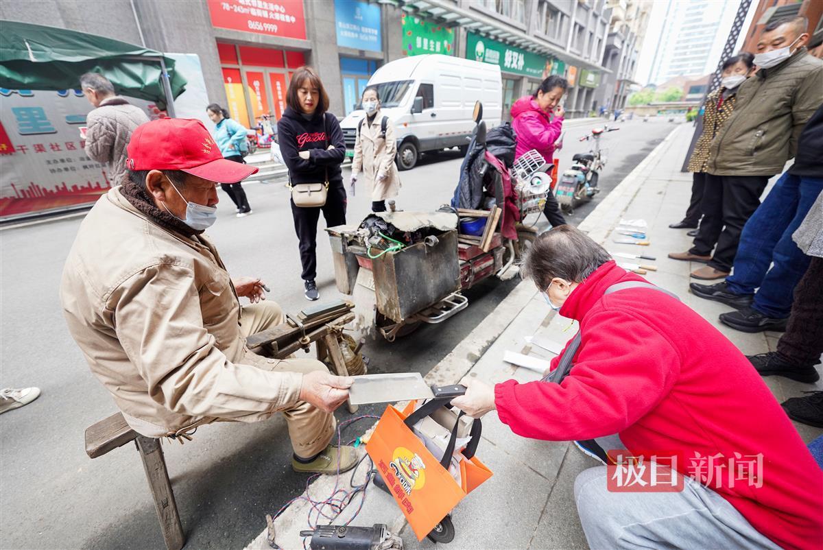 整整一个多小时里,汪水明一刻没停歇,虽然胳膊累得抬不起来,但他手里的活却从未停下。“我磨刀已经35年了,上班时周末出来摆摊,退休后干起全职。家里人心疼我,每次出门都在我口袋里备好创口贴。”汪水明乐呵呵地和记者分享着这些年磨刀的经历。