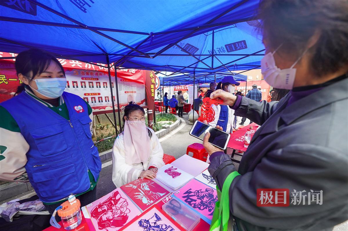 “哇,这个小兔子剪得真精美,能不能教教我呀。”“怎么教孩子进行阅读?”现场,钢都花园街道社工站的剪纸达人李诗瑶和红卫路街道社工站带来的亲子阅读项目吸引了不少居民驻足拍照、询问。
