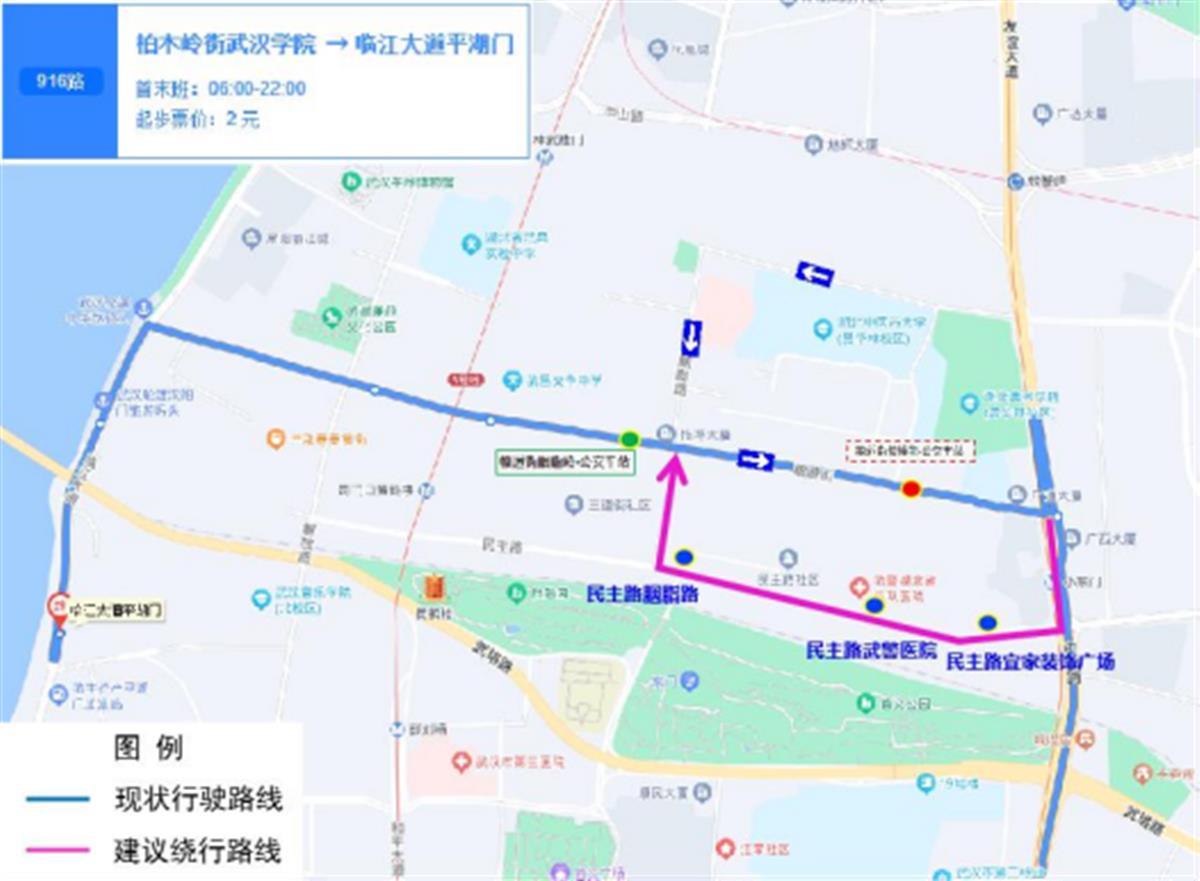 1、柏木岭街武汉学院→临江大道平湖门方向:现状由中铁十一局路口掉头至粮道街;调整后需在中山路粮道街路口继续沿中山路直行至中山路民主路口右转,绕行民主路-胭脂路至粮道街胭脂路口公