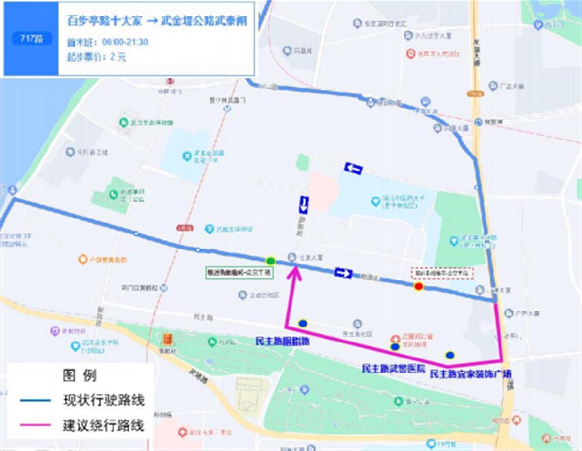 1、百步亭路十大家→武金堤公路武泰闸方向:现状由粮道街直行;调整后需在中山路粮道街路口继续沿中山路直行至中山路民主路