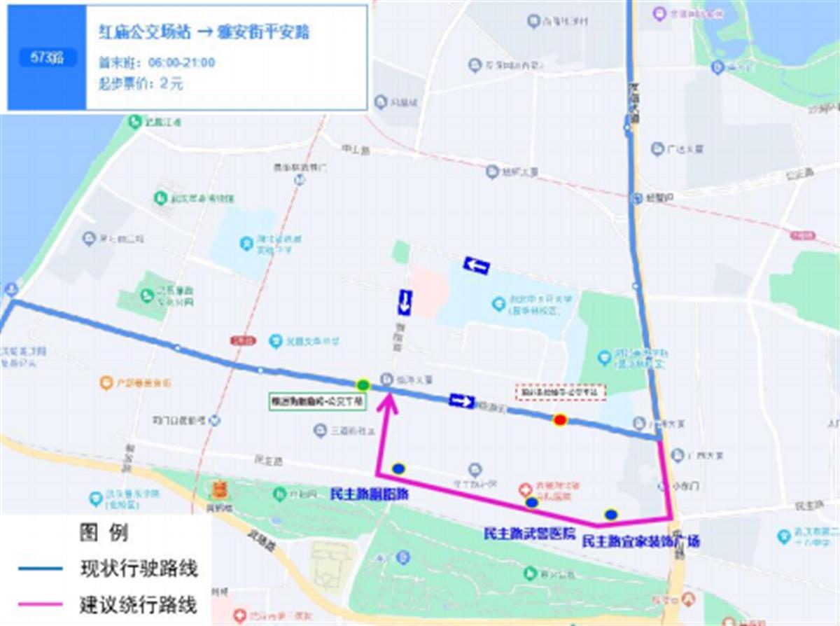 2、调整后错过停靠站点1站:粮道街恰博苑公交站。新增站点3站:民主路宜家装饰广场、民主路武警医院、民主路胭脂路。