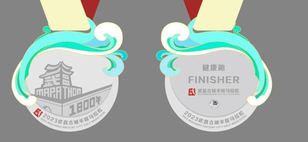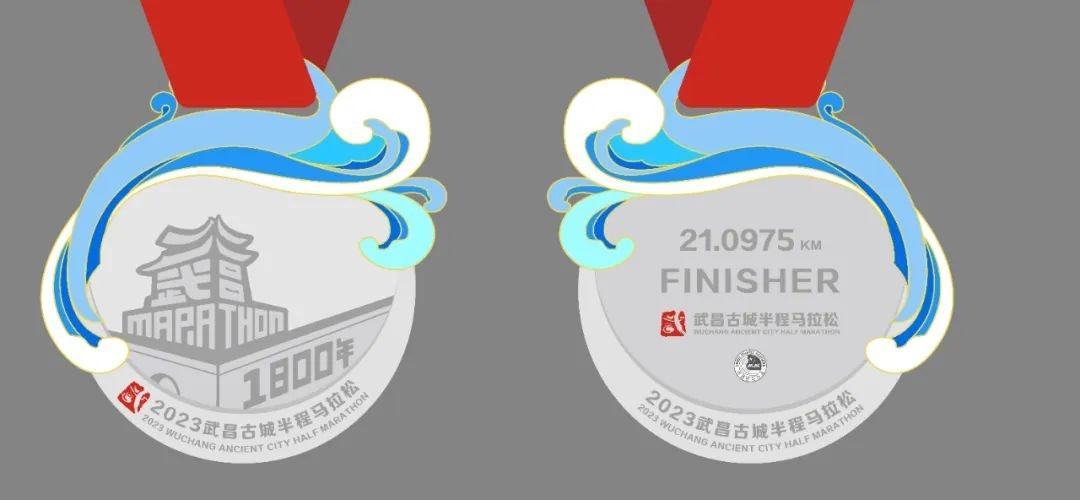 完赛奖牌围绕着“跑出加速度,武昌正青春”理念进行设计。古朴厚重的起义门轮廓,象征着武昌的起点;镌刻的1800年字样,记述着武昌城发展的历程;环绕的浪花,则让人仿佛听到正青春的武昌奔涌的声音。