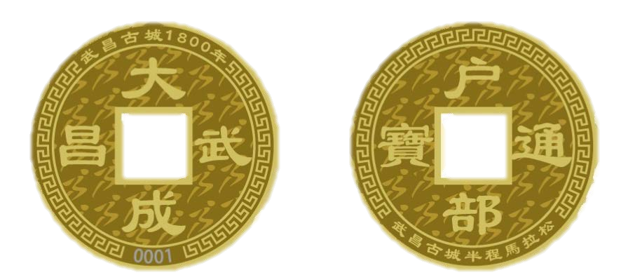户部通宝是为了纪念武昌古城半程马拉松而特别设计的,整体造型设计为古铜钱样式,正面刻有“大成武昌”与“武昌古城1800年”的字样,极具纪念意义。
