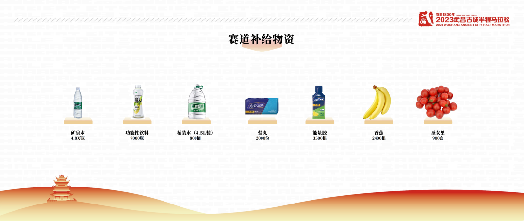 赛事沿途将为选手提供充足的补给,共设置7个饮水饮料补给站,2个能量补给站。包括5KM、10KM、15KM、20KM设置的4个饮料饮水站,7.5KM、12.5KM、17.5KM设置的3个饮水用水站,到12.5KM及17.5KM处,选手还可享受到包括盐丸、能量胶、香蕉、圣女果等在内的多品类补给。