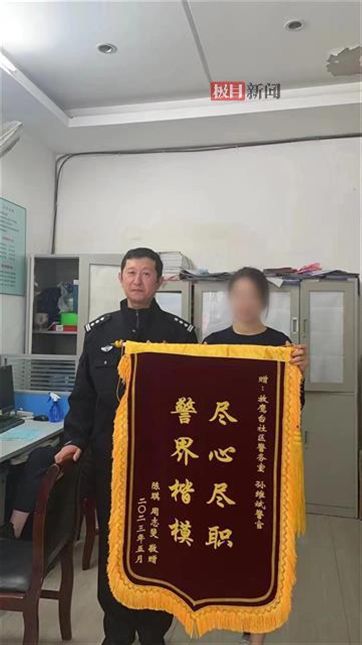 “太感谢你了老孙,都要退休了还这么尽心尽力,我们一家真不知道该怎么感谢你。”说罢,陈某硬要往孙维斌怀里塞礼品,但孙维斌笑着回绝了陈某,“礼物我可不能收,分内之事,我这也是站好最后一班岗嘛。”图为孙维斌收到锦旗