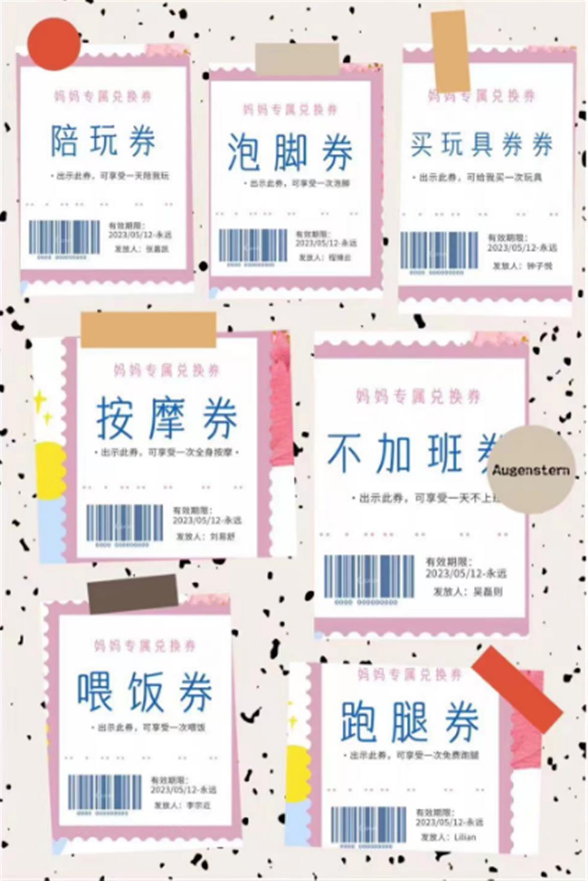 爱,要用实际行动来表达!在社工的倡议下,小朋友手绘专属兑换券送给妈妈,并配上甜甜的祝福。有了这些兑换券,在妈妈最需要的时候,孩子们可以化身小超人,帮助妈妈做一些力所能及的事情。孩子们精心装饰的奖券层出不穷,有捶背券、家务券、陪同吃饭券、抱抱券、按摩券、跑腿券……每一种颜色、每一个图案装饰的卡片都很特别,诚意满满,又充满童趣。