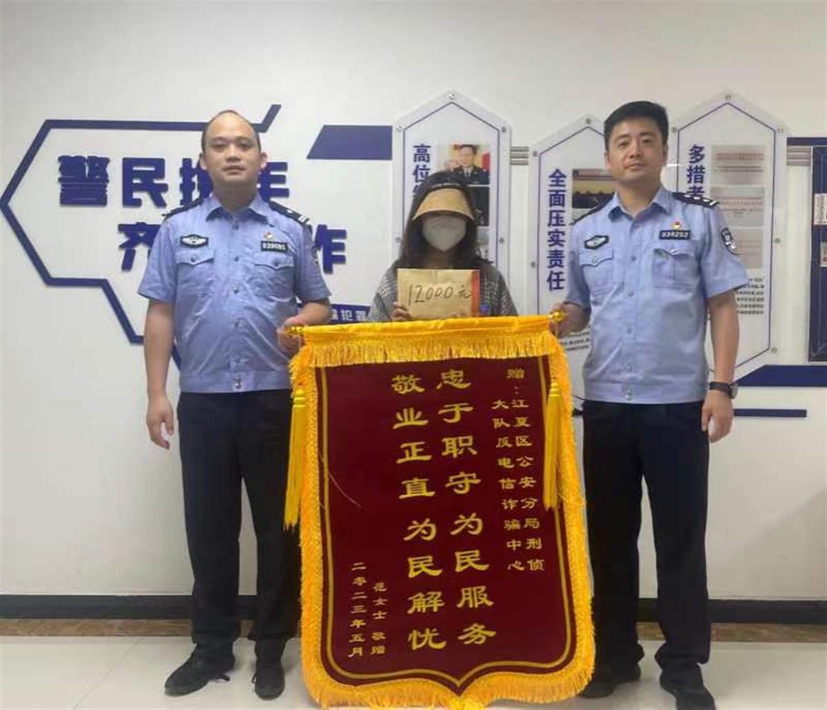 5月23日上午,范女士将一面“忠于职守 为民服务 敬业正直 为民解忧”的锦旗送到江夏区公安分局反诈中心,对民警表示感谢。