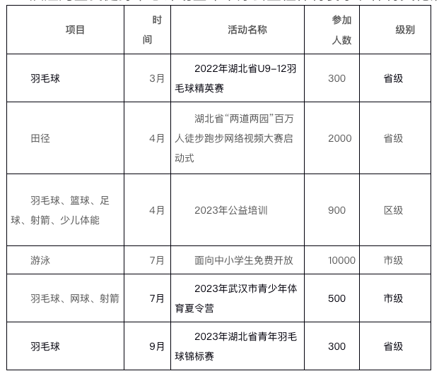 汉江湾全民健身中心计划全年举办公益性体育赛事、体育文化活动不少于4场。