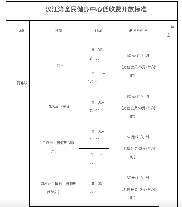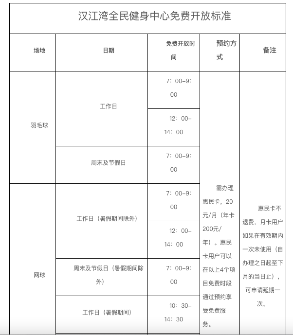 根据《体育总局办公厅关于实施公共体育场馆向社会免费或低收费开放补助资金管理办法做好公共体育场馆开放工作有关事宜的通知》(体群字〔2022〕31号)要求,现将武汉市硚口区汉江湾体育公园全民健身中心(简称汉江湾全民健身中心)2023年免费、低收费开放工作方案公告如下: