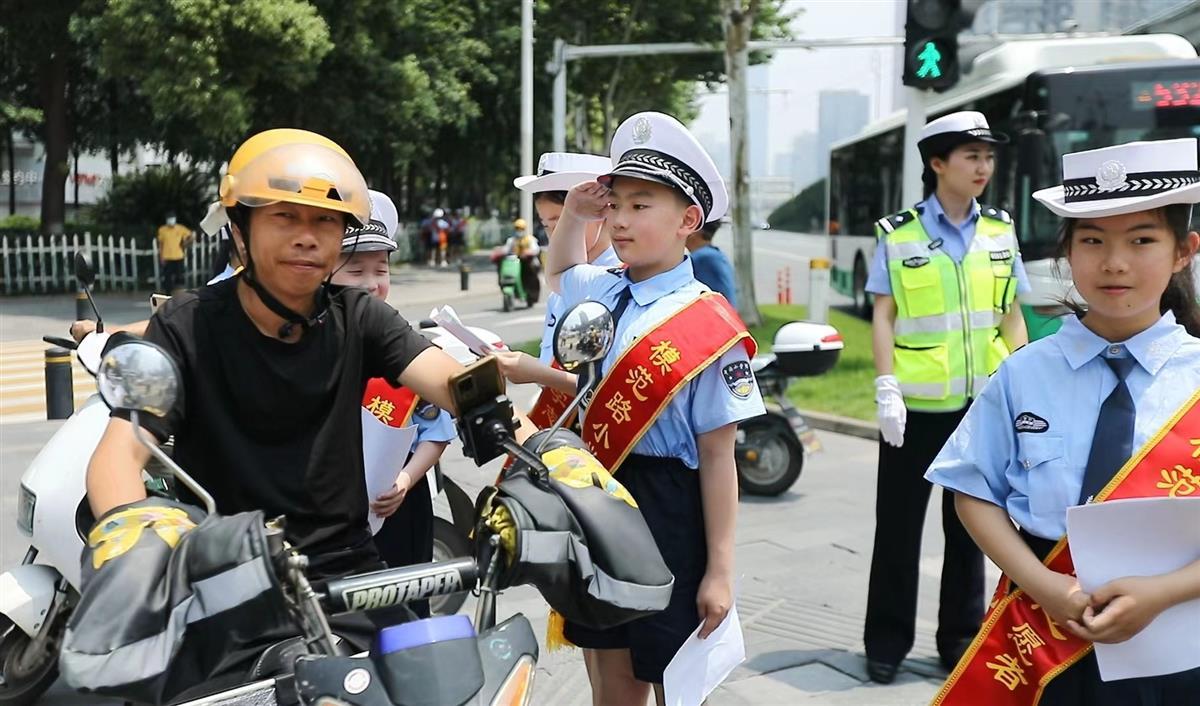 江岸交警为了增强小“交警”的社会责任感,锻炼孩子们与人交流沟通的能力,还专门在辖区路口设置整治岗,带领小“交警”们参与交通安全宣传教育活动。