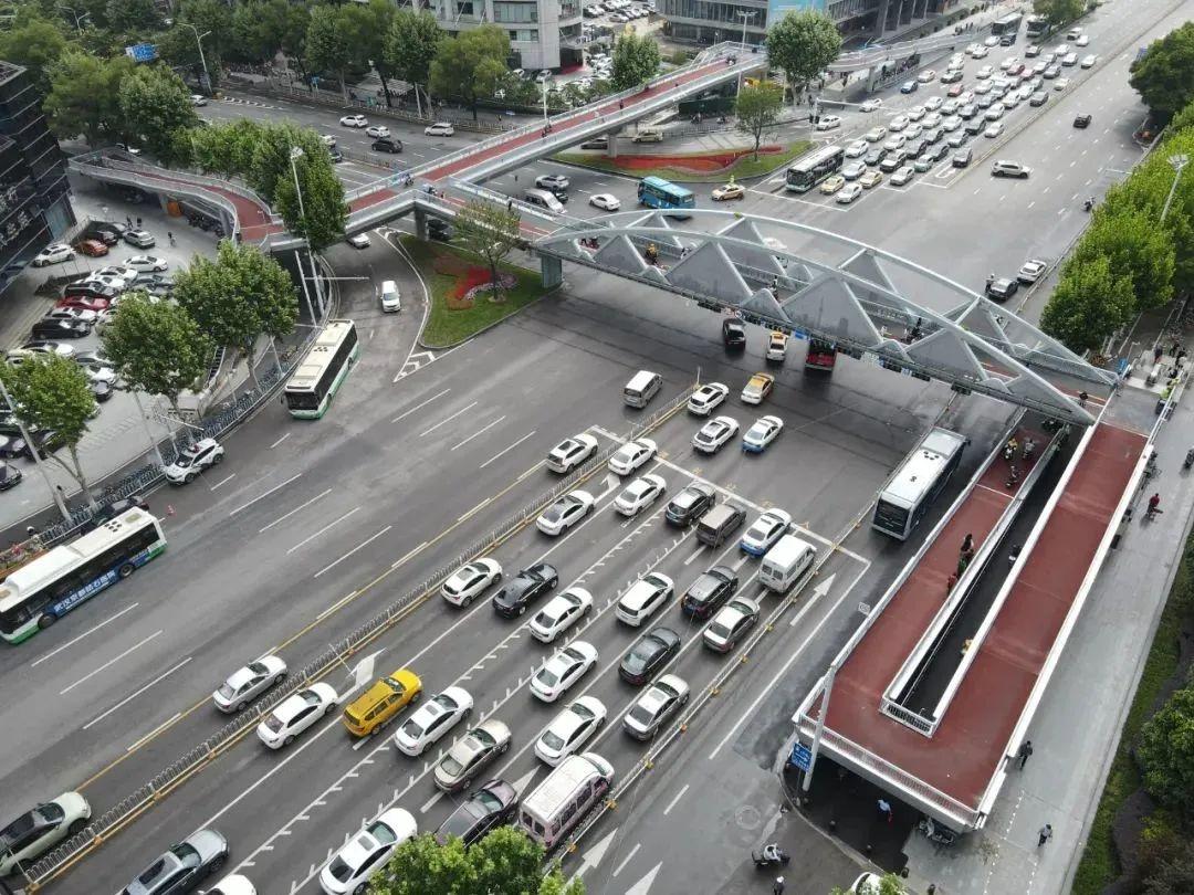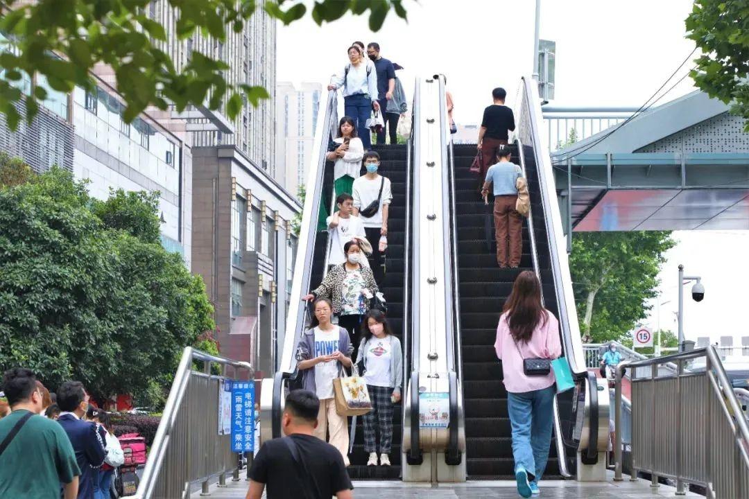 此次改造在亚朵酒店一侧增加了两部手扶电梯。目前,天桥共有六部电梯供行人通行,每日7:00至21:00开放,由城管部门安排专人负责现场引导和保洁工作。