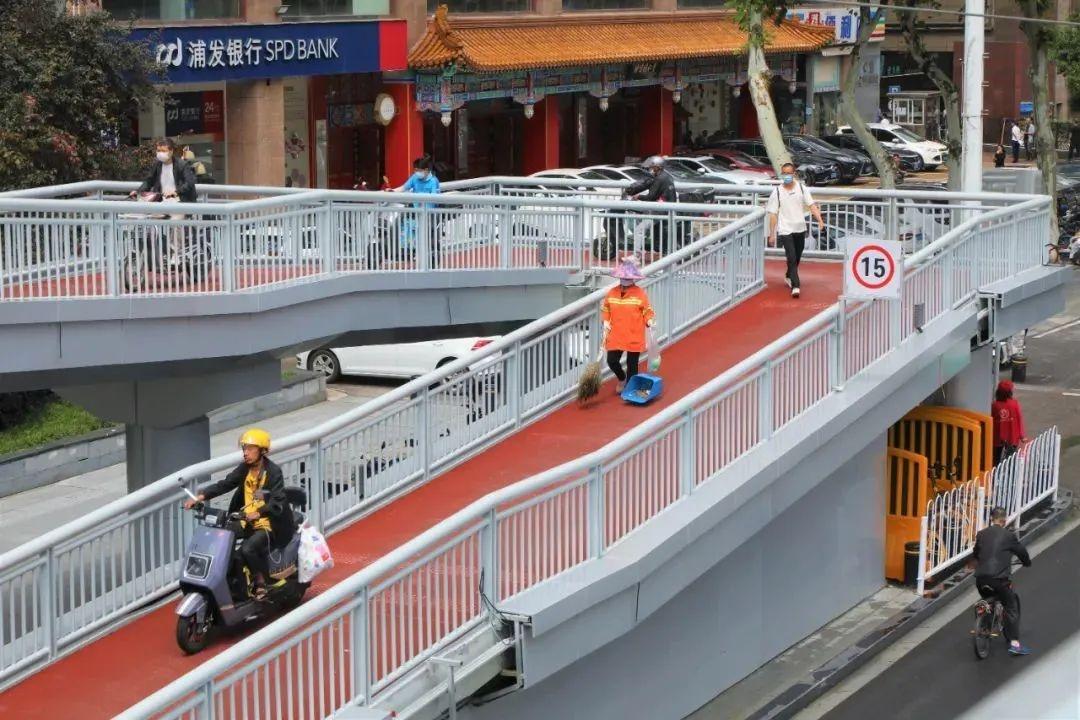 天桥上,主桥面设置了灰色和红色区域,引导非机动车和行人通行。