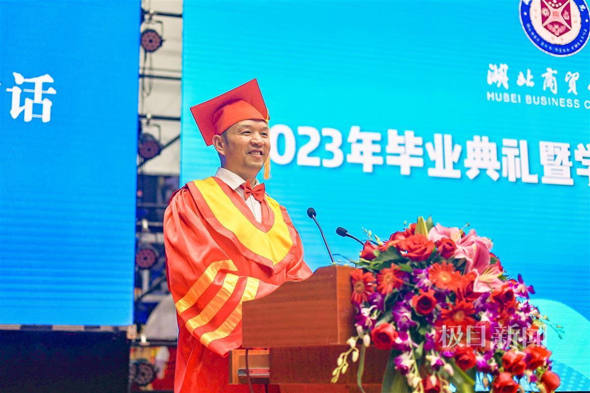 毕业典礼上,校长陈卓国教授以“青春不散场,一起向未来”为题,向毕业生送出寄语。他表示,2023届毕业生见证了众多历史时刻,经历了世纪疫情,顺利通过了疫情大考,不仅是大国正在崛起、民族走向复兴的亲历者,也见证了学校的巨大发展变化。他希望同学们脚踏实地,做行稳致远的湖商人;致知笃行,做知书达理的湖商人;砥砺品格,做品德高尚的湖商人;积极应变,做永不止步的湖商人;处变不惊,做热爱生活的湖商人。“你们要始终铭记‘梦想、行动、智慧、快乐’的校训,在社会的大学中用一次次完美的蜕变,诠释青春无限的张力,以积极向上的姿态开创美好未来!”校长陈卓国深情喊话毕业生。