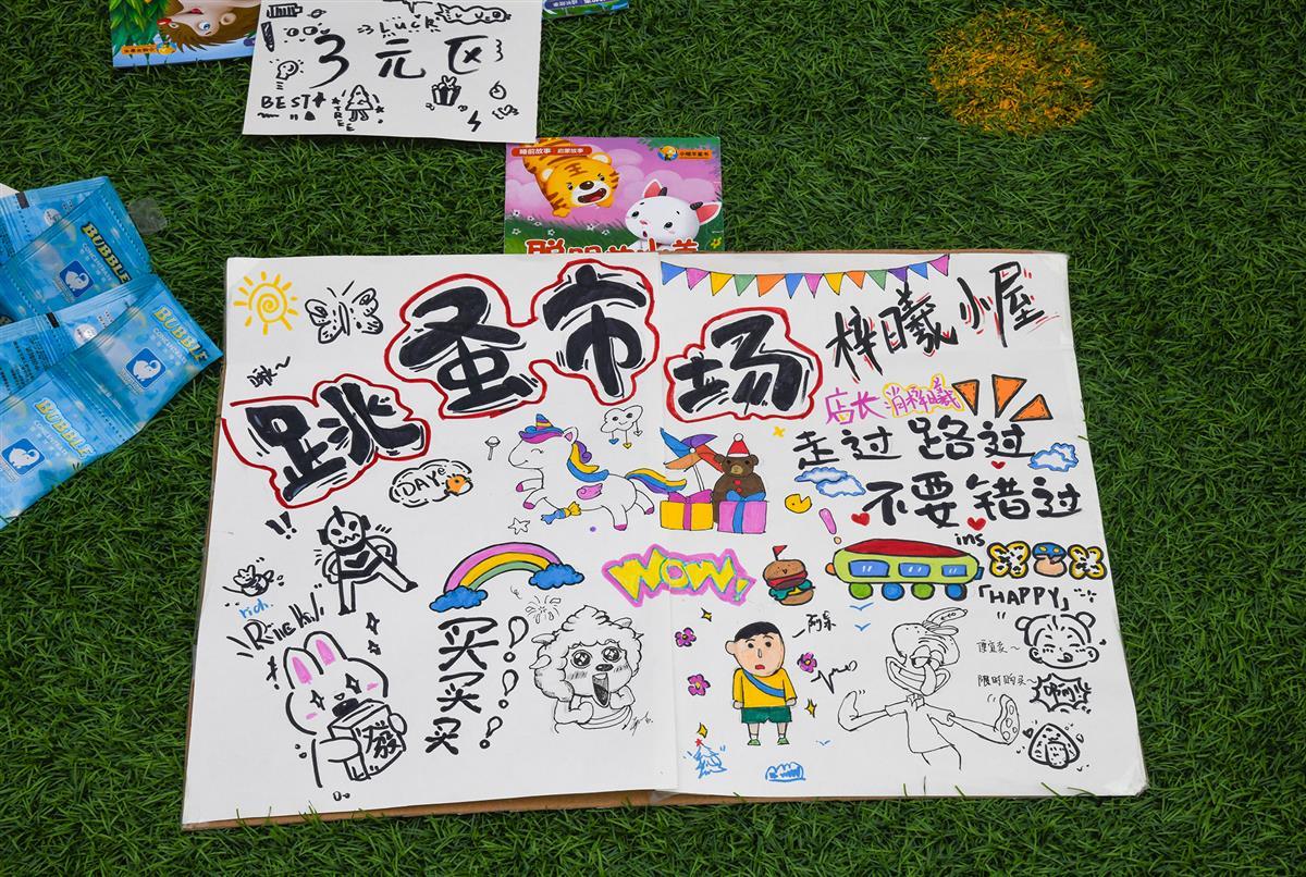 活动中,“小鬼当家”“翔哥小铺”“老板年纪小 商品随便挑”“杂货铺开业啦”等宣传海报精彩亮相,玩具、学习用品、小饰品等琳琅满目的商品整齐有序地摆放在摊位上。