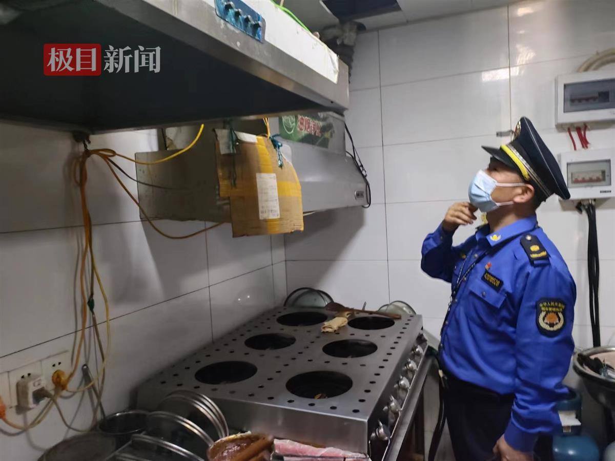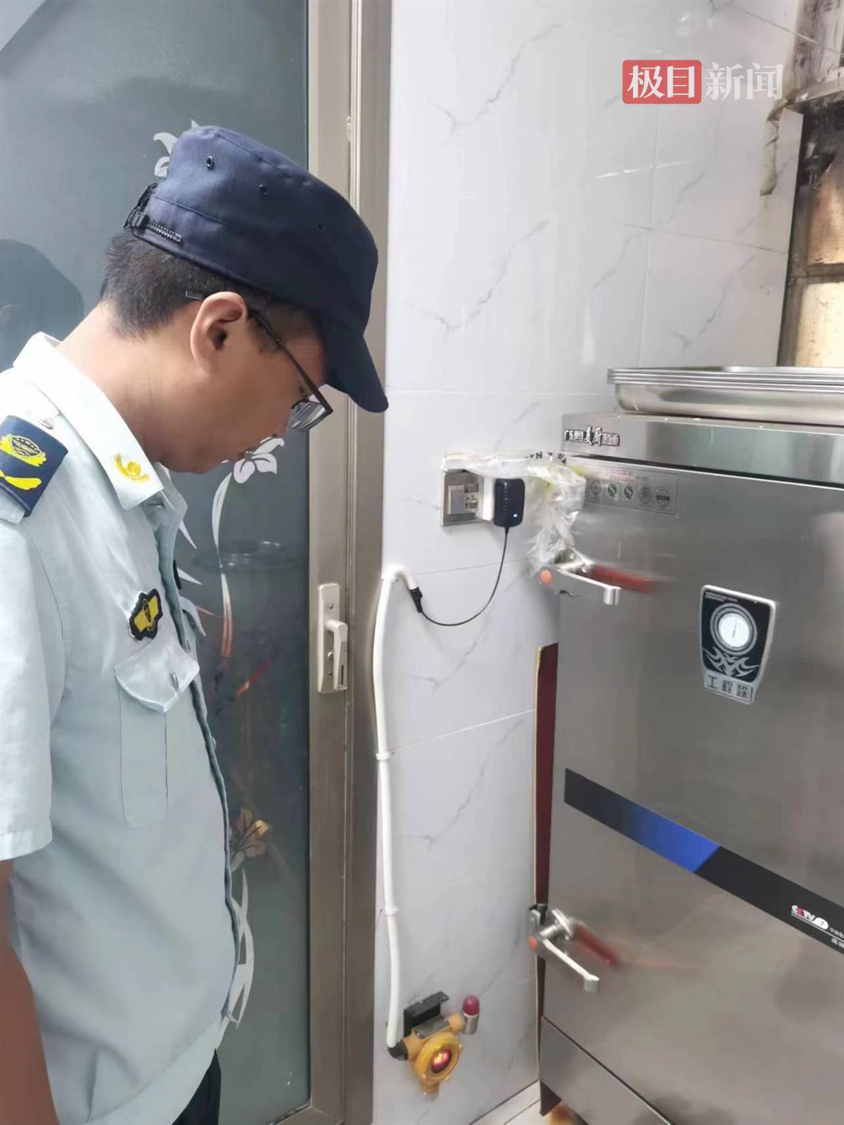 6月20日,在径河街一家牛肉面馆中,执法人员首先检查了燃气设备间有无堆放杂物,燃气管道上有无悬挂物及私接热水器等违法行为,并确认燃气报警器、灶具熄火保护装置是否运行正常。