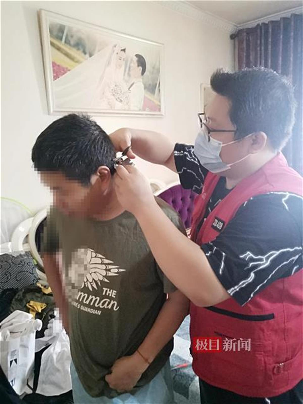 禁毒社工杨凯上门家访时为社区戒毒人员理发