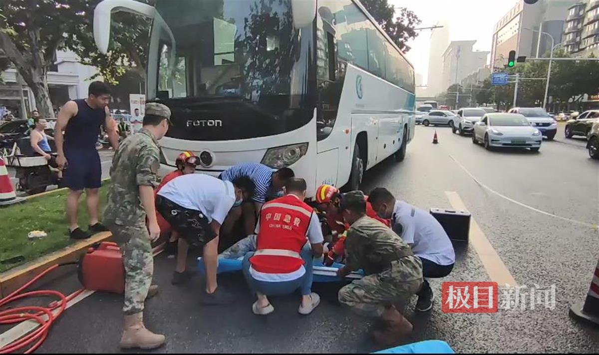 报警人冯先生讲述,当日早上他所乘坐的大巴通勤车行驶至事发地时,一名骑电动自行车的男子不慎被卷入大巴车车头底部,车内乘客立刻下车察看,众人本想将男子从车底拉出,因担心会对男子造成二次伤害,随即决定将车头抬起。此时,附近的海军工程大学几名战士也迅速赶来,众人合力仍未能将车头抬起。直至消防员赶到,最后成功将男子解救出来。