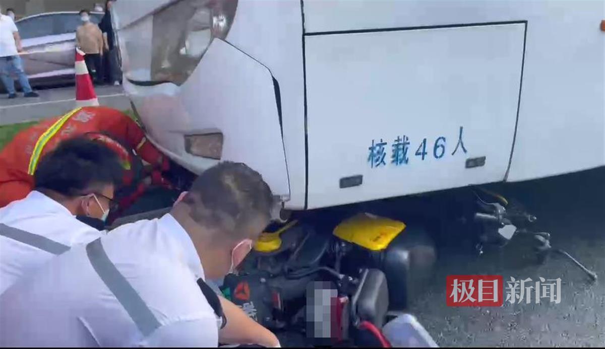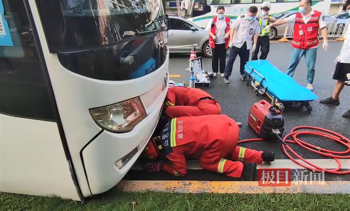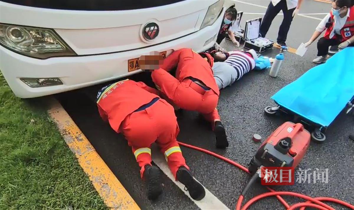 6月26日早晨7时许,武汉市硚口区解放大道上,一名骑电动自行车的男子不慎被卷入大巴车车头底部。宝丰路站消防员紧急赶赴现场救援,和众人一起将男子营救出来。