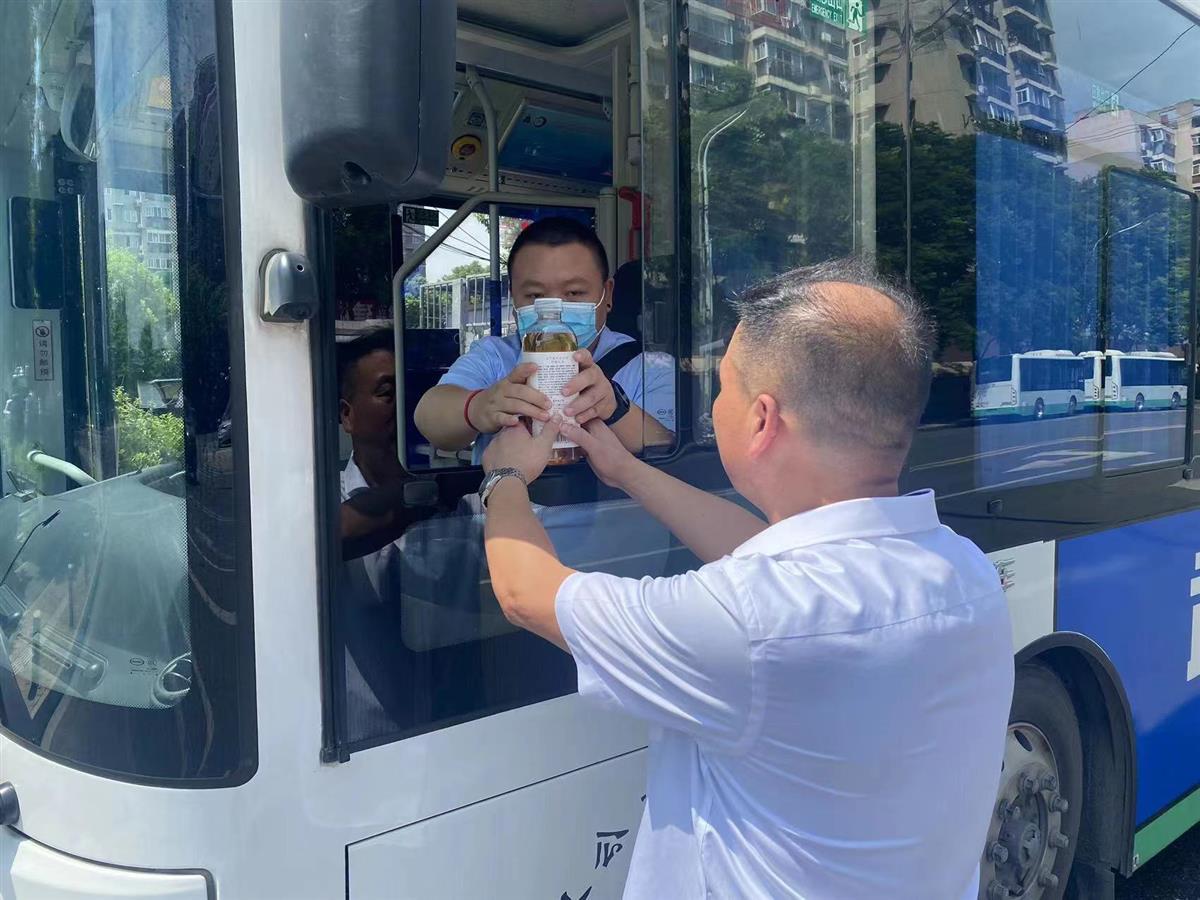 12日12时,室外气温直逼38摄氏度,公交508路线长何平和管理人员抬着两箱冰汽水,来到解放大道永清街站点,将一瓶瓶“能量水”递送到线路驾驶员手中,为他们解暑降温。