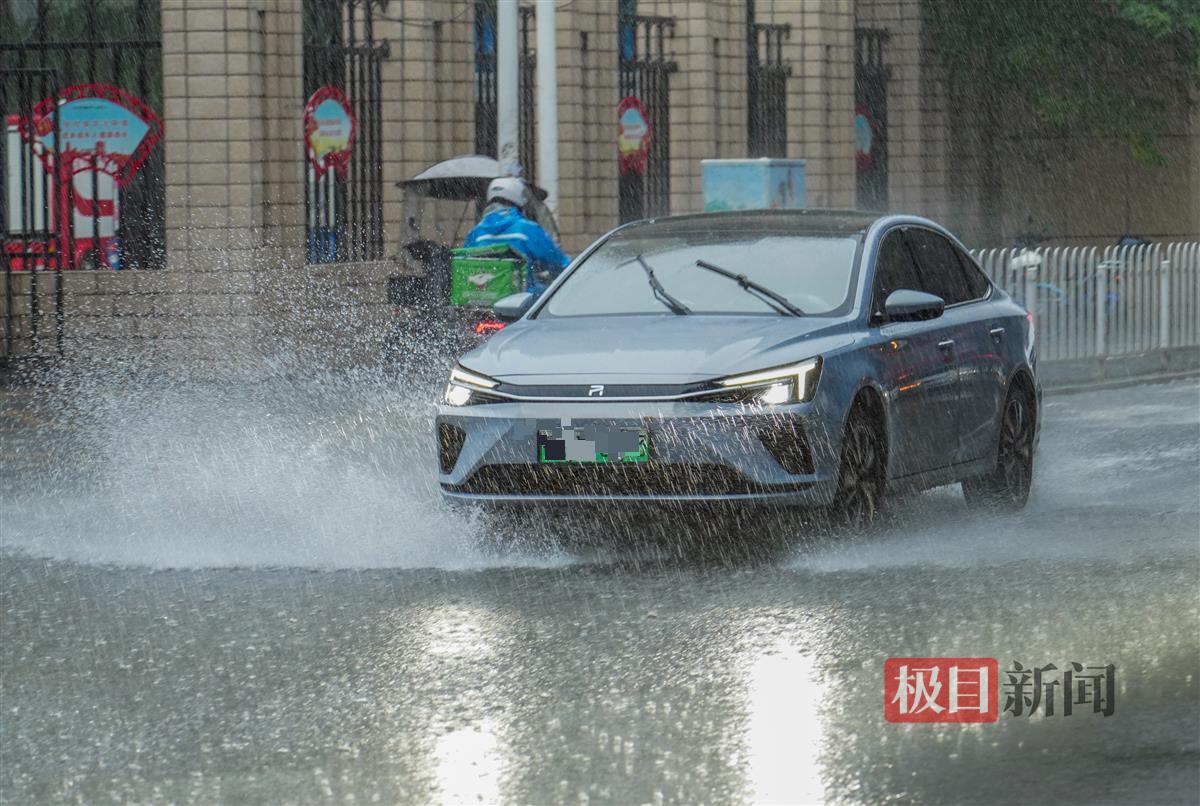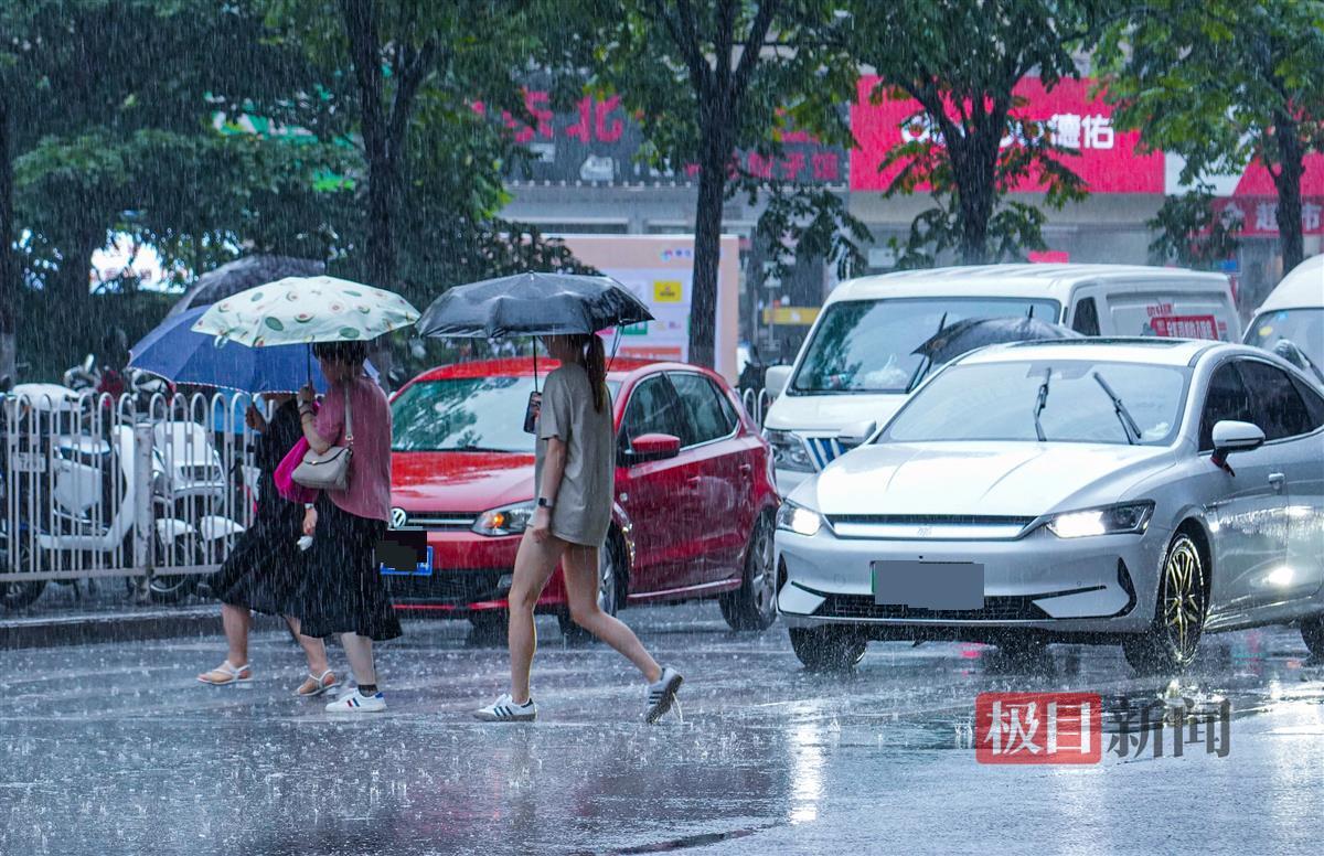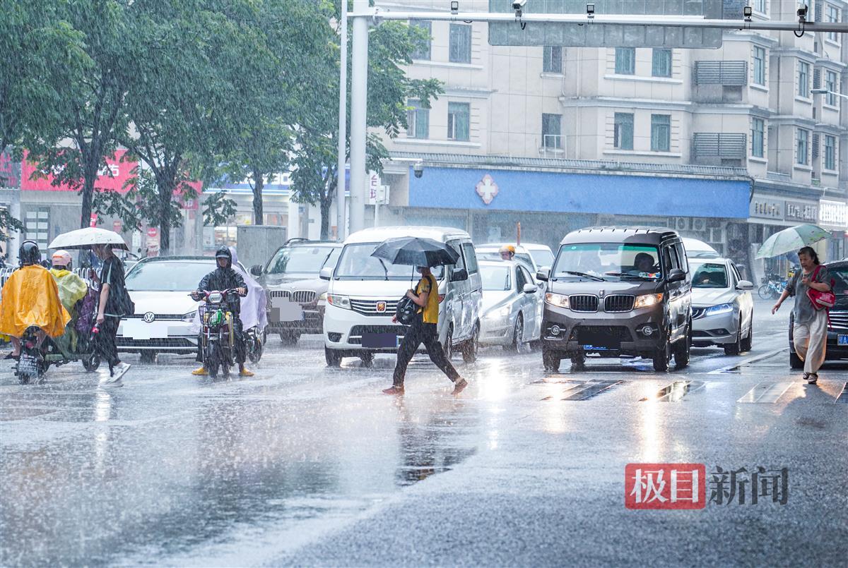 一时雨来急,武汉洪山区雄楚大道上,冒雨过街的人不得不涉水