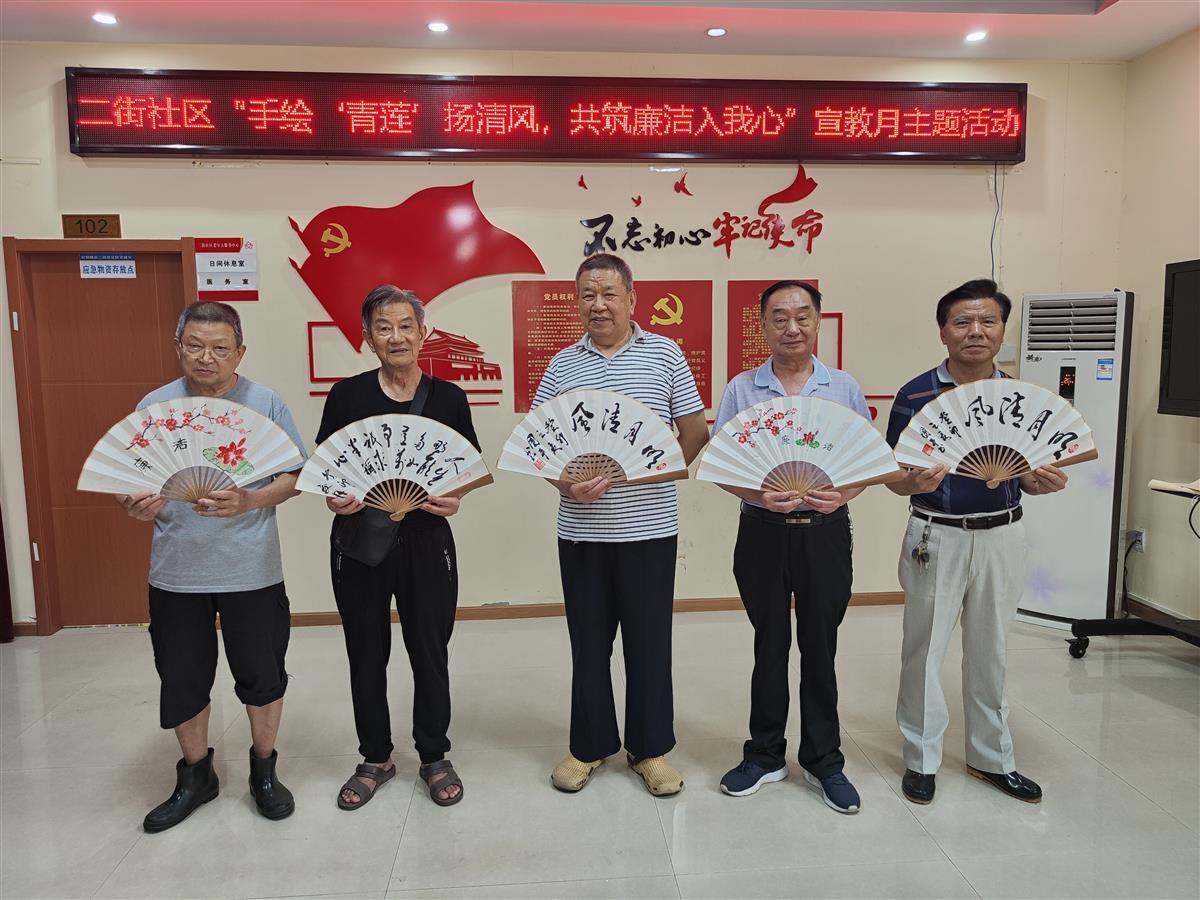 社区挖掘擅长写廉字、绘廉画的冯国平、袁志才、付泉生、马中美、曾祥武等老师,传授书法和绘画技艺,带领居民在折扇上书写各种字体的“廉”字及有关清正廉洁的名言、古诗词、格言警句,绘画傲霜斗雪的梅花、出淤泥而不染的莲花、虚怀若谷的竹子……,大家以“廉洁”为主题自由创作。