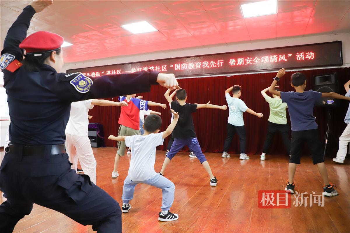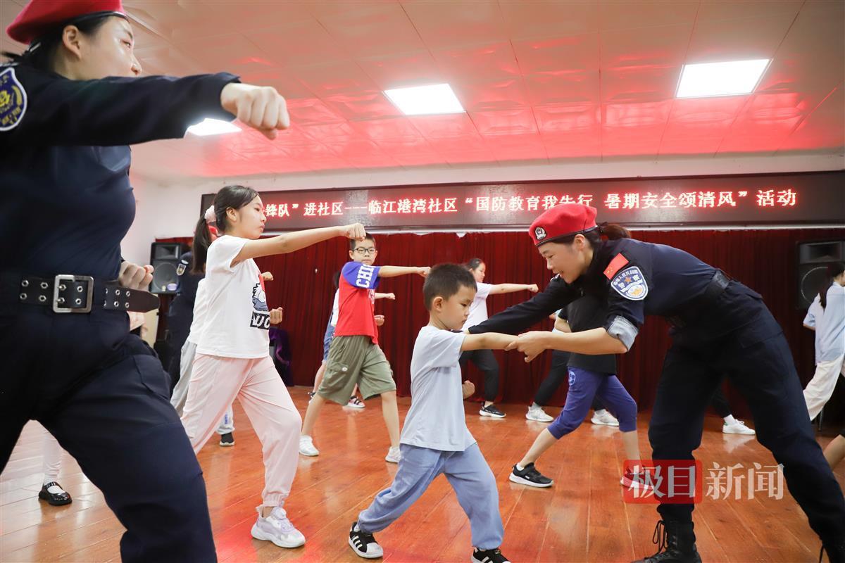 “拳头放太高了,往下放一点……对,就这样,太棒了!”7月20日,武汉市青山区红钢城街临江港湾社区活动中心,11名小朋友在女特警队员的带领下,认真学习五步拳基础动作,仅仅几分钟便掌握了基本要领。孩子们的精彩表现,赢得在场家长的阵阵掌声和欢笑声。