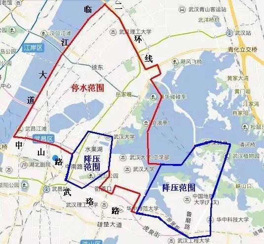 停水减压区域:临江大道德平路至中山路和平大道二环线至中山;友谊大道联盟路至中山路;团结大道才汇巷至友谊大道;欢乐大道二环线至楚河汉街;国盛街、铁机路、杨园街、四美塘路、才华街、才林街、才茂街、铁机西路、杨园南路、秦园路、武车路、新生路、前进路、一马路、四马路、徐东大街岳家咀至梨园、华电小路、东亭路、翠柳街、黄鹂路、车家岭街、兴国北路、兴国路。兴武路、兴国南路、兴沪路、八一路珞狮路至卓刀泉路;珞狮北路、卓刀泉北路、东湖南路、沿线用户无水。楚汉路、松竹路、白鹭街、天鹅路、春蕾路、水果湖路、北环路、水果湖横路、洪山路、东一路、东一小路、东三路、东四路、洪山侧路、中南三路、姚家岭街、东湖南路、珞喻路卓刀泉至关山大道;鲁磨路、植物园路、东湖绿道、武汉大学一带水压下降或高层无水。